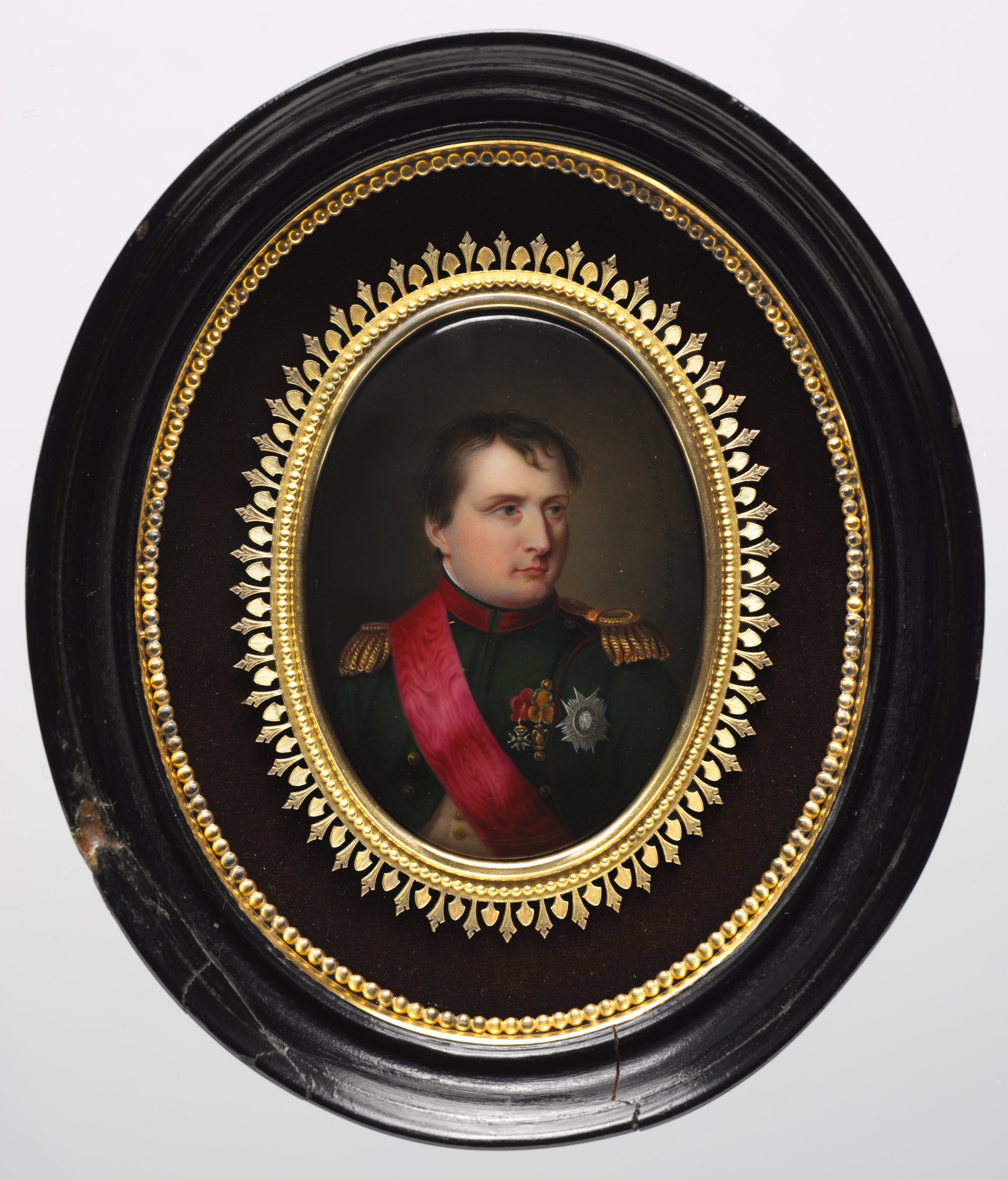 The image shows a portrait of Napoleon I, Emperor of the French. The portrait is oval-shaped and centered within a black frame with a gold border. The frame has a thick black outer rim and a thinner inner rim with a gold leaf design. Inside the frame, Napoleon I is depicted wearing a green military uniform with gold epaulets on the shoulders, a red sash across his chest, and a silver star-shaped medal on his left side. He has short brown hair and is looking to his right. The background of the portrait is dark brown. The frame appears to be circular and has some visible scratches and marks on its surface.