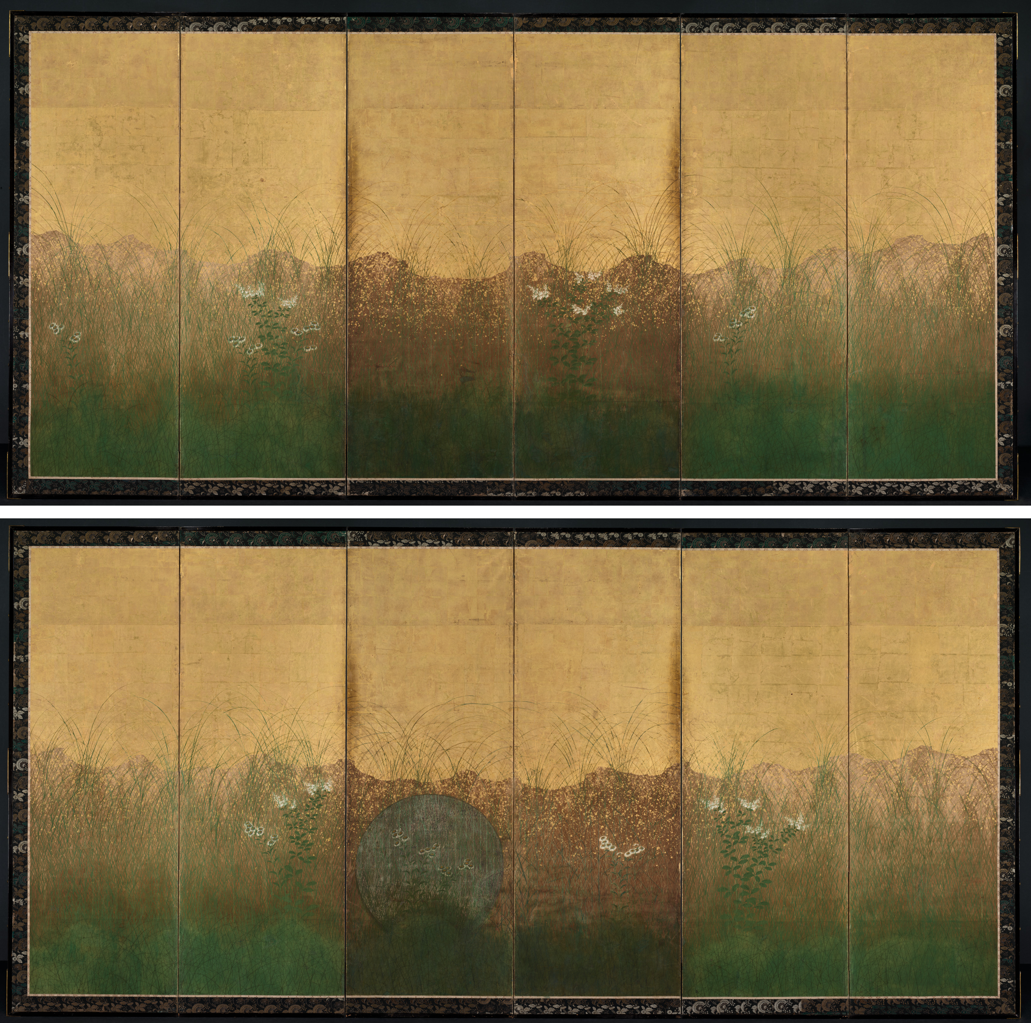 Six-panel folding screen with a gold background, divided into two rows of three panels each. The top row depicts a grassy plain with tall green and brown grasses and white flowers, and distant mountains. The bottom row depicts the same scene with a large gray boulder in the center. Black frame with gold floral pattern around the edges. Title: Autumn Evening with Full Moon on Musashino Plain. Artist: attributed to Ogata Kenzan.