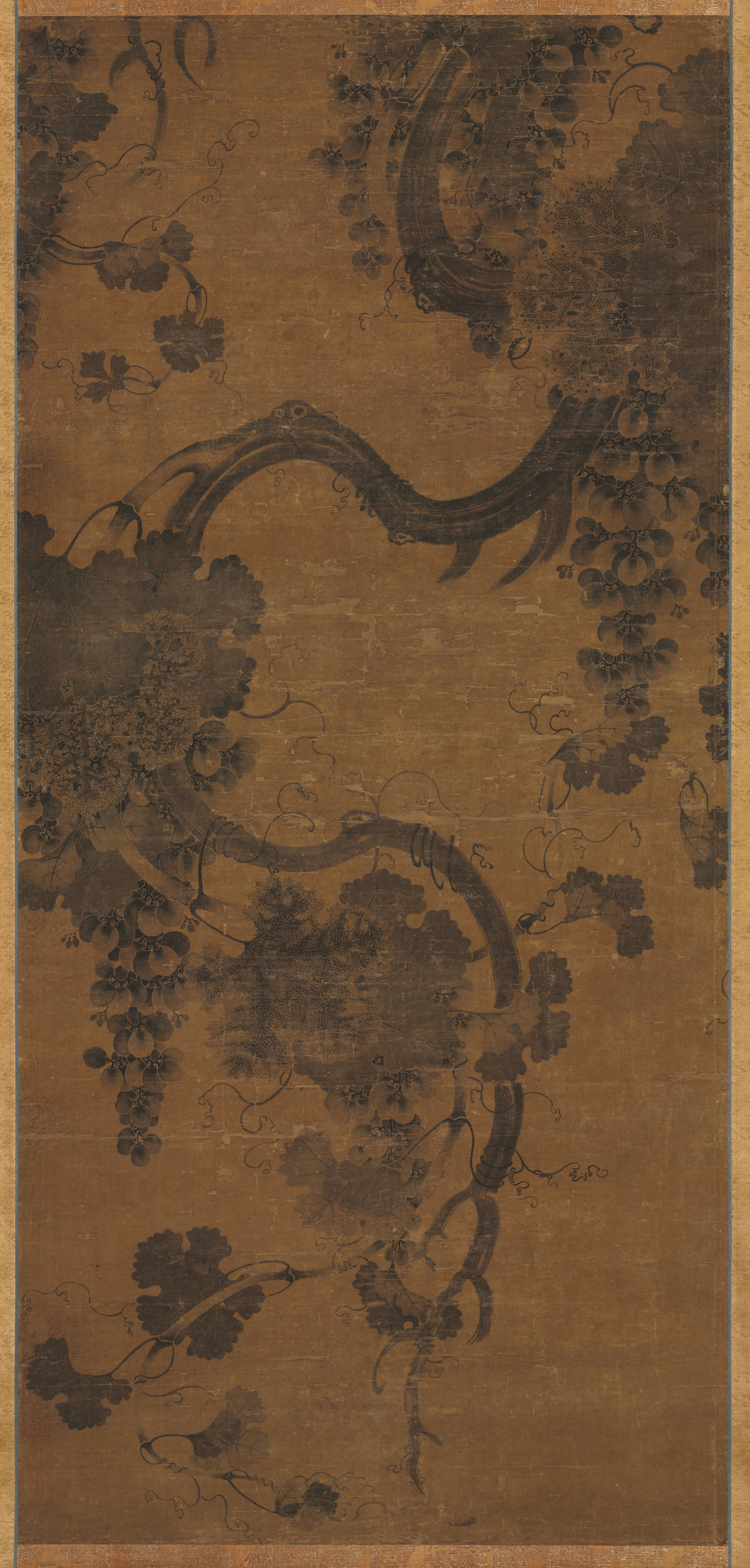 The painting, titled "Grapes" by an unknown artist, depicts a brown background with a light brown border. Dark brown grapevines and clusters of grapes are painted on the surface. The vines twist and turn in various directions, with some areas appearing darker due to shading. The grapes are clustered in bunches along the vines. The overall appearance suggests an aged painting with visible signs of wear.