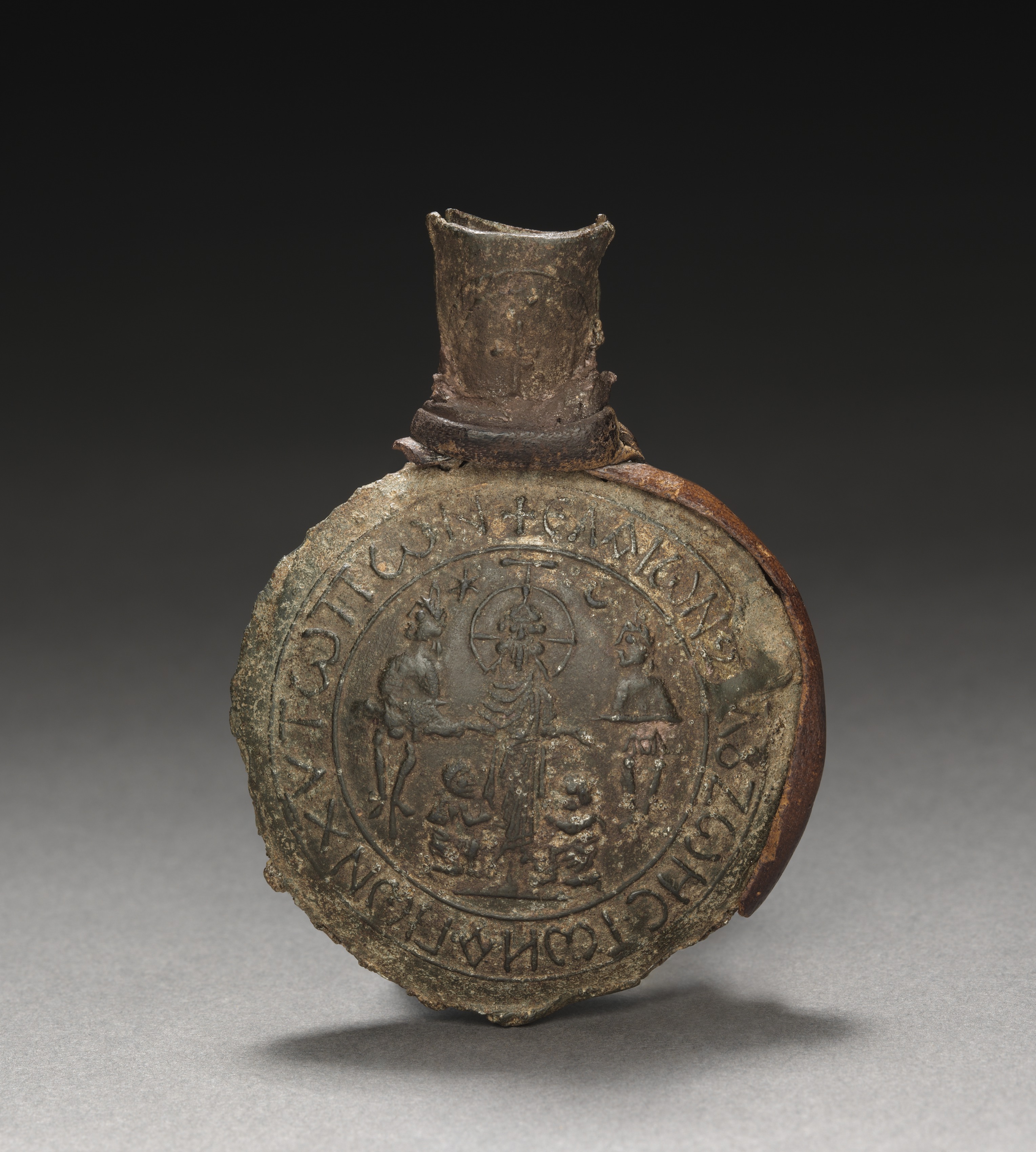 Brown metal object with worn surface. Round body with jagged edge. Top has short cylindrical neck. Circular relief on body, featuring cross, two people on either side. Text surrounds relief. Object resembles a bottle.