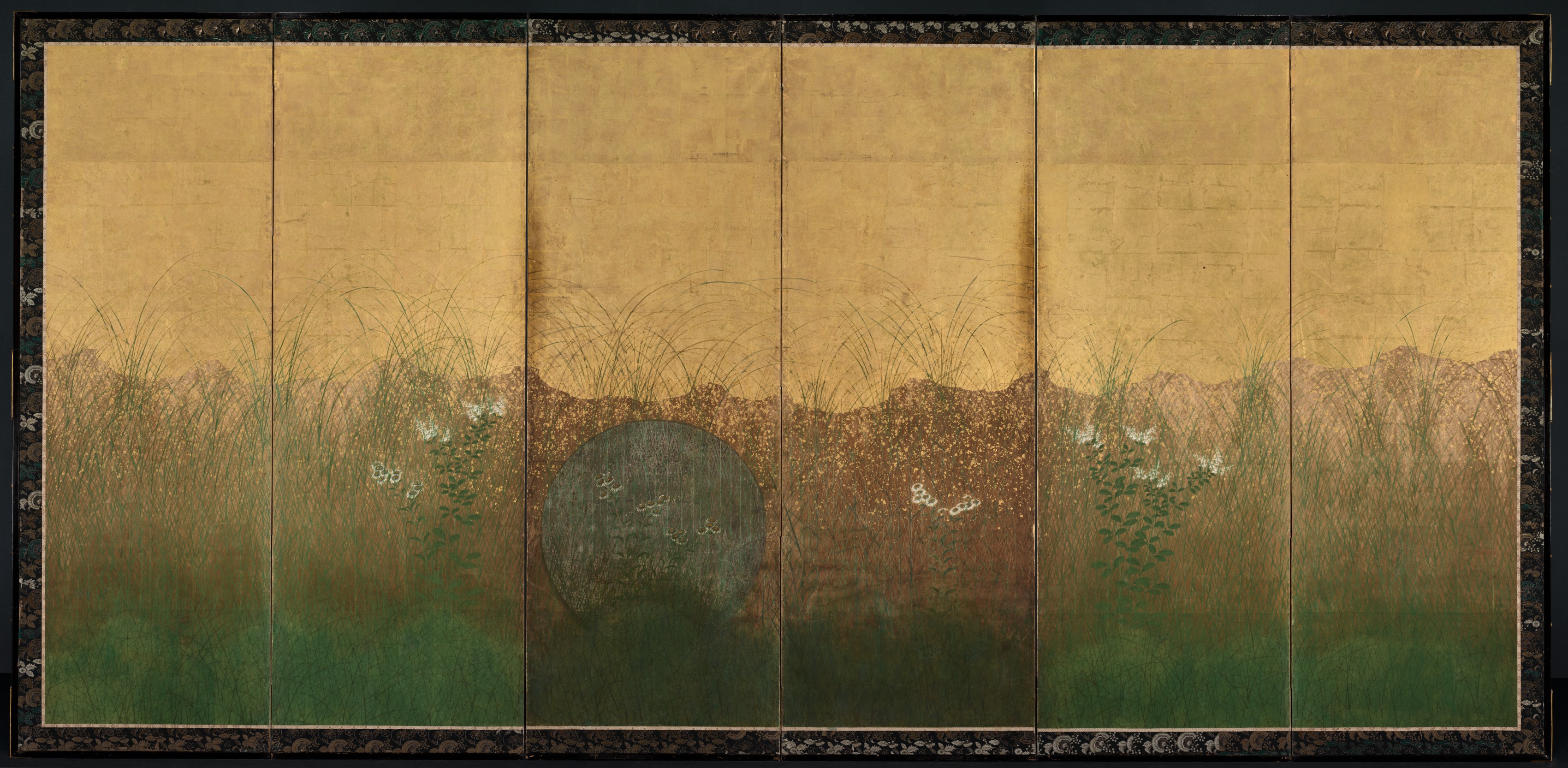 Six-panel folding screen with a landscape scene. The background is gold at the top, fading to shades of brown and green towards the bottom. There are tall grasses and white flowers painted in shades of green, brown, and white. In the center of the screen, there is a large gray or blue-gray shape that resembles a boulder or a rock. The panel edges and outer frame have a black border with a decorative gold pattern. The artist is attributed to "Ogata Kōrin" and the title is "Autumn Evening with Full Moon on Musashino Plain".