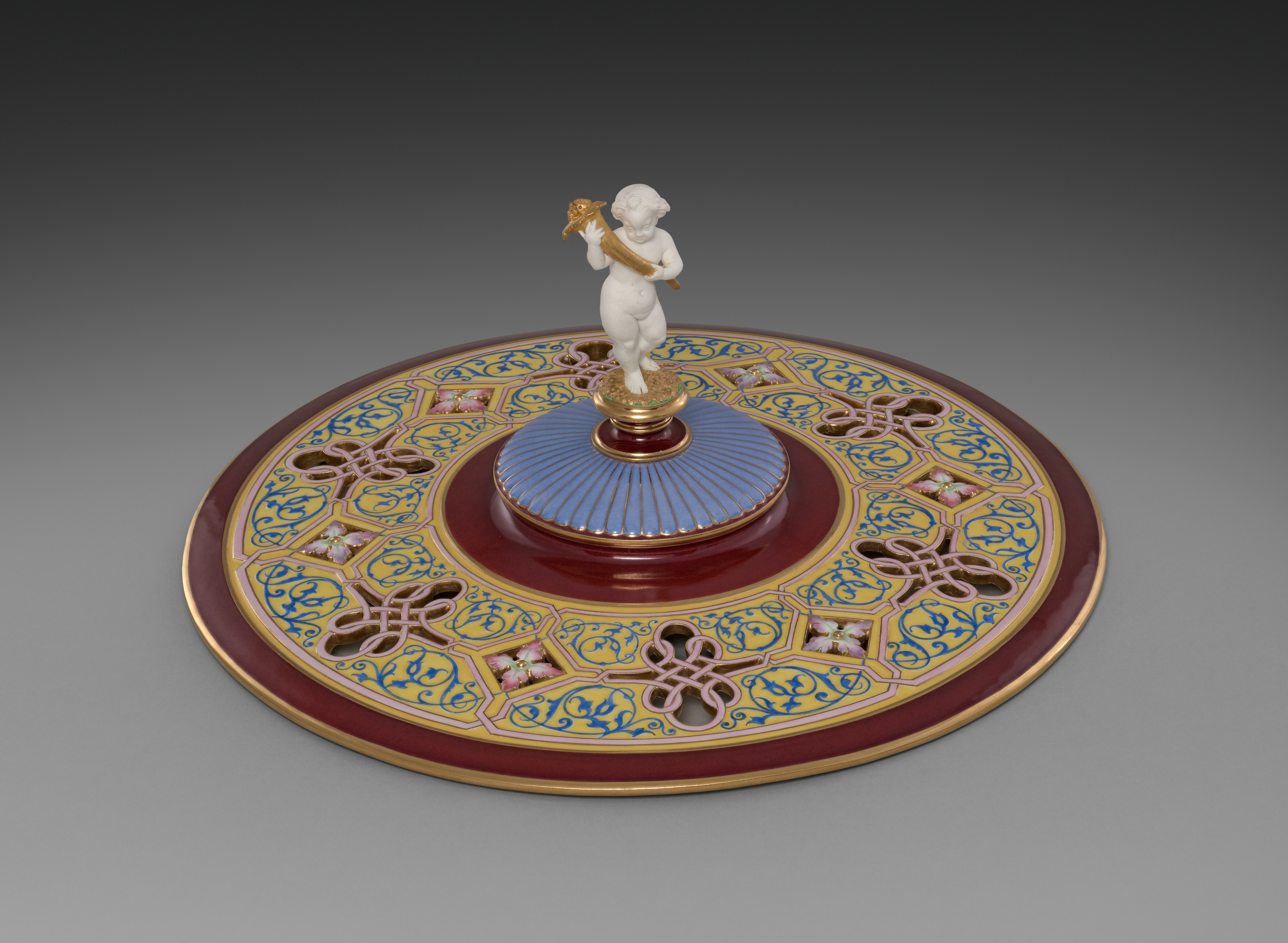 Round, flat, ceramic dish with a wide, decorative rim. The rim is red with gold trim and a pattern of blue, yellow, pink and white designs. The center of the dish has a short, cylindrical, blue base with a gold rim. On top of the base is a small, white, nude figurine of a child. The child holds a gold object in their left hand. The figurine stands on a small, gold base. The background is grey.