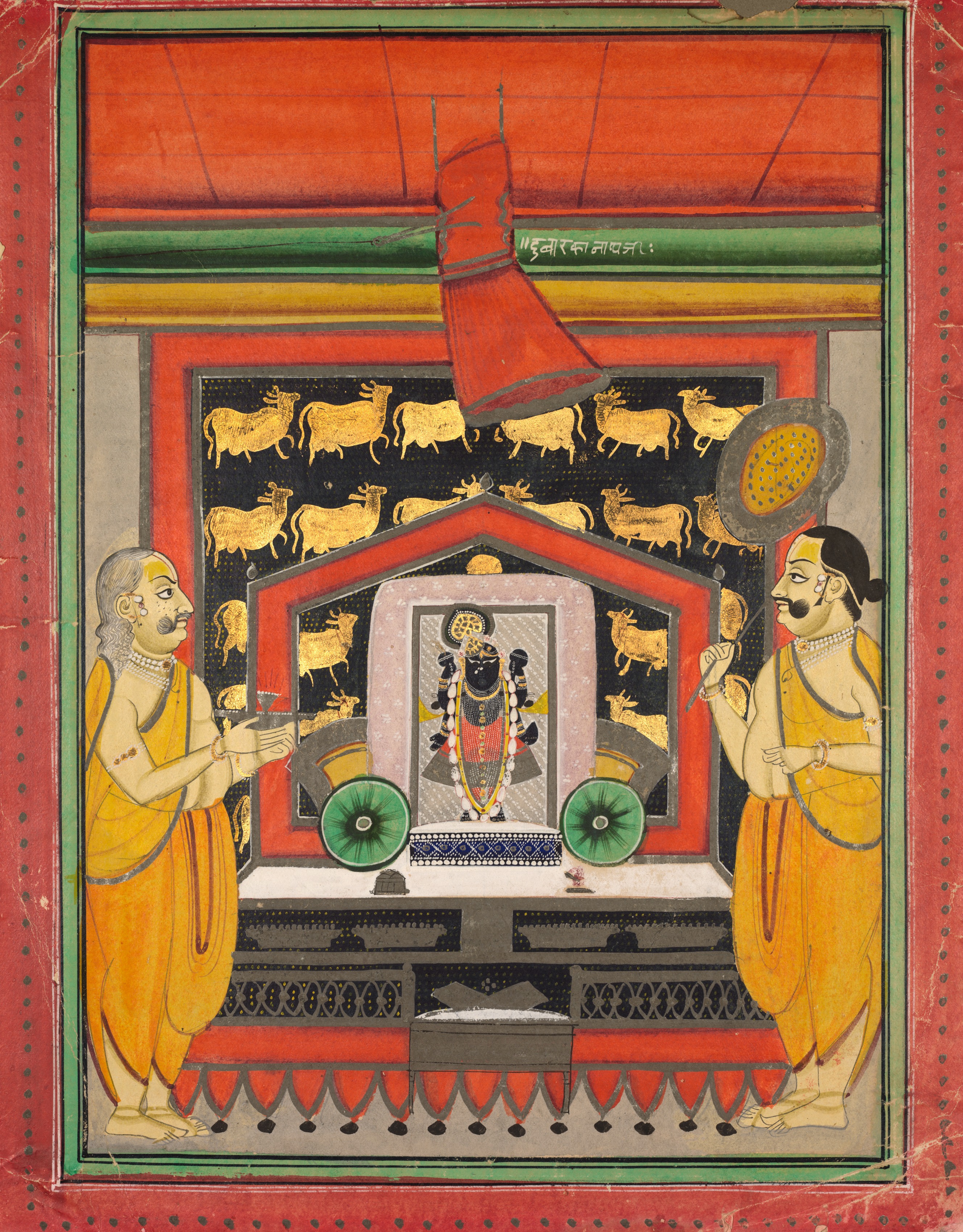 The painting depicts Worship of Dvaraka Nathji at Kankroli by artist. The artwork features two men in yellow outfits standing on either side of a shrine. The man on the left has gray hair and a mustache, and holds an object in both hands. The man on the right has dark hair and a mustache, and holds a stick with a round object on top. The shrine has a red border with a gray and red roof. A figure with dark skin and a red outfit is inside the shrine. Two green wheels are on either side of the shrine. The background features a black section with gold cows. A red, green, yellow and gray border surrounds the painting with small green dots. A red cloth hangs down from the top center. The image depicts Dvaraka Nathji at Kankroli.