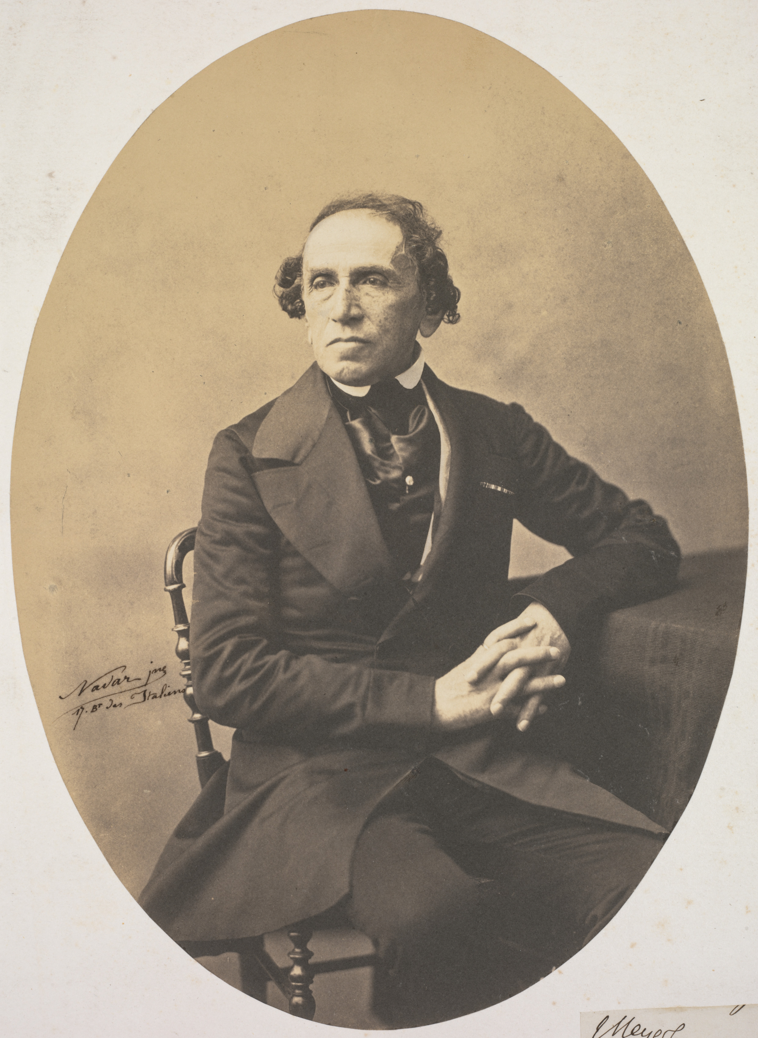 Oval-shaped sepia-toned photograph of a seated man. He has curly hair parted on the side and combed over the top of his head. He wears a dark-colored three-piece suit with a waistcoat and a white collared shirt. A patterned silk cravat or necktie is tied loosely around his neck. His hands are clasped and rest on the arm of a chair. He sits on a chair with turned legs and a curved back. The background is a plain wall. The photograph has a signature in the lower-left corner and a small label with a signature in the lower-right corner.