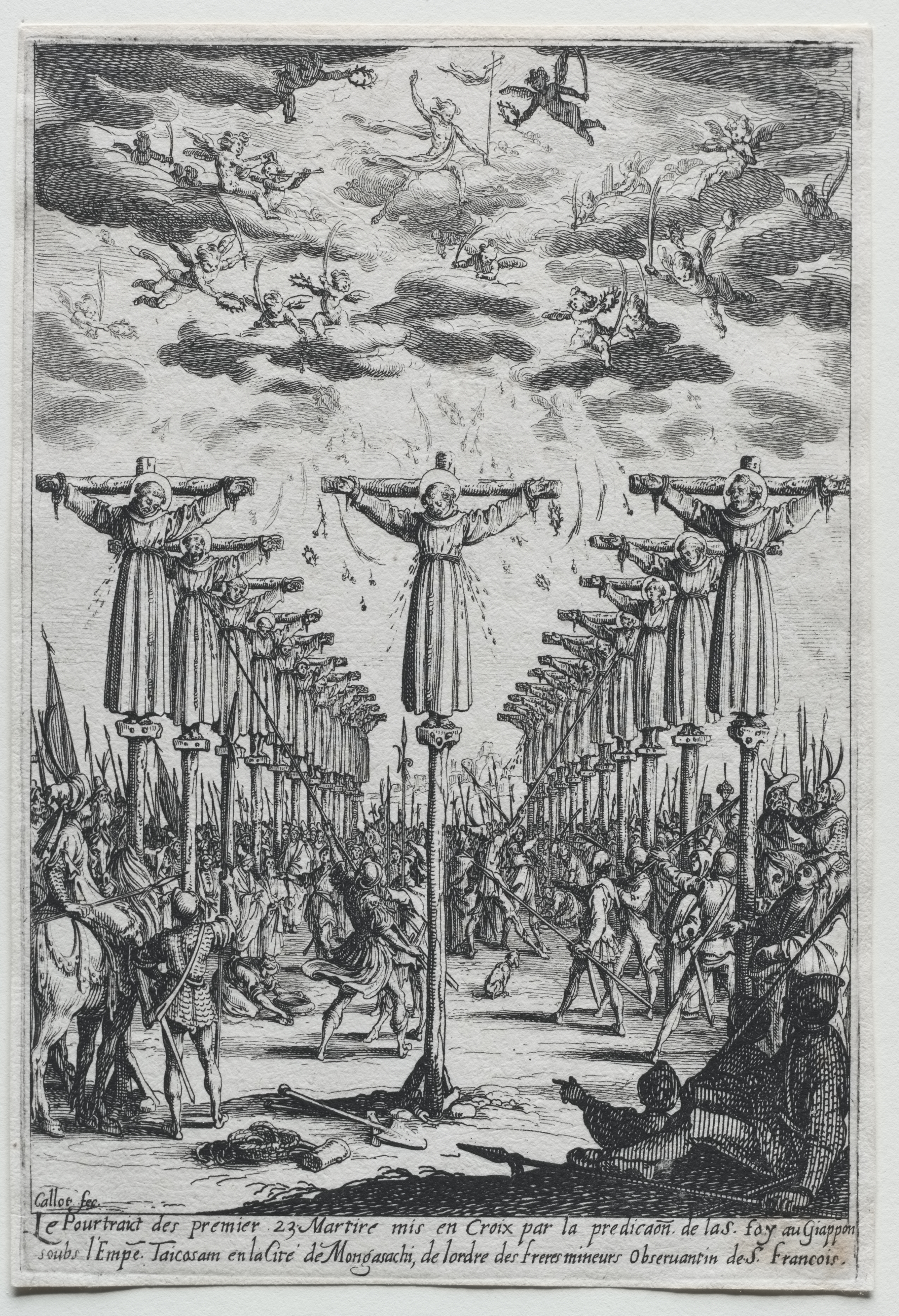 Black and white image of a row of Christian men on crosses. The men on the crosses have their arms outstretched. They are wearing robes and are nailed to the crosses. There are people on horses and on foot, some holding spears or bows and arrows. There are clouds and figures of people flying in the air at the top. A crowd surrounds the crosses on either side.