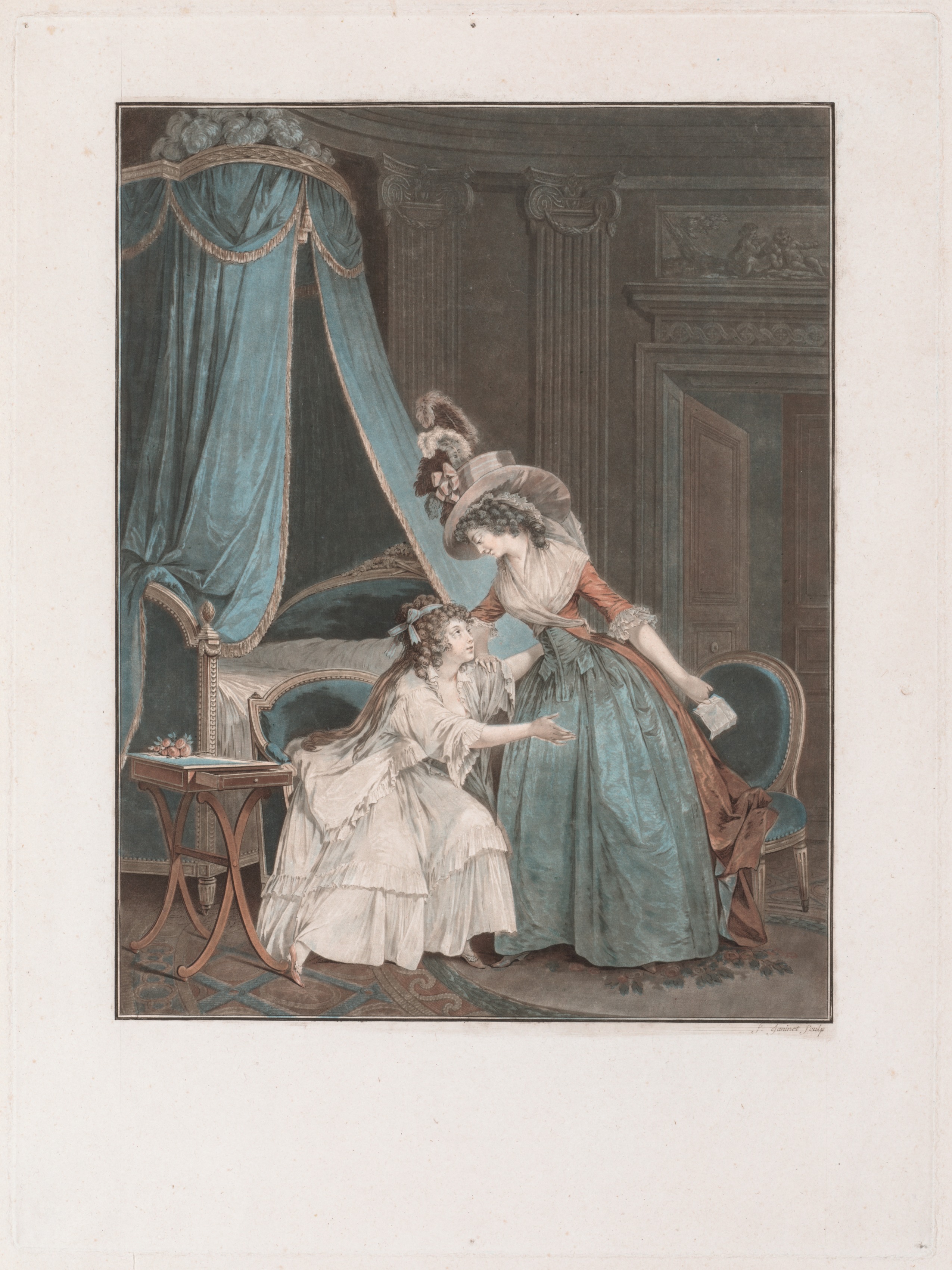 A colored engraving depicting two women standing in a bedroom. The standing woman on the right wears a rust-colored dress with puffy sleeves and a light-blue skirt with an orange underskirt; she also wears a white shawl. The seated woman on the left wears a white dress; she also wears a headband. A large four-poster bed with blue drapes is on the left; a small table is next to it. A chair is on the right. The background includes a doorway with columns. The title is "The Indiscretion" and the artist is Jean François Janinet.