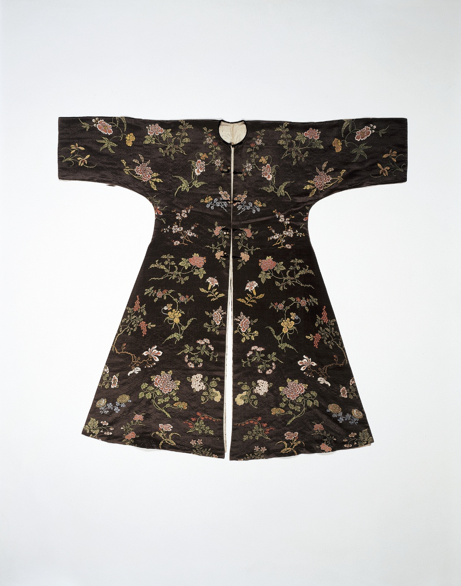 The garment is a dark brown silk robe. The robe has wide, short sleeves. A circular white fabric piece is at the top center of the robe. The robe is zipped up the middle with a thin white cord. The robe has a floral pattern with pink, white, blue and yellow flowers and green leaves. The robe flares out at the bottom. The robe appears to be a woman's robe. The background is white.
