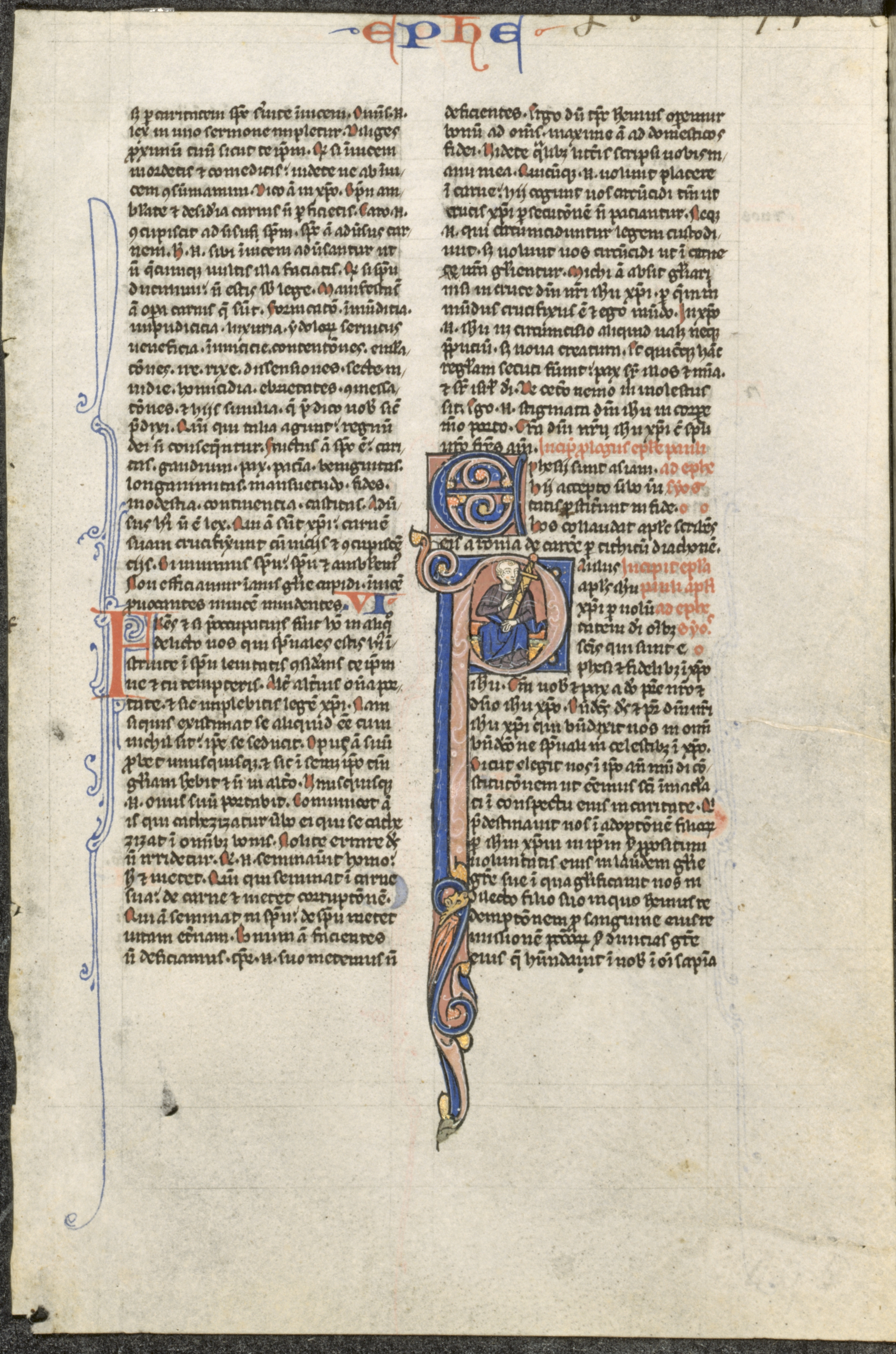 A yellowed, aged piece of parchment with black text written in a language that appears to be Latin. The text is arranged in two columns. A large, decorative letter "P" is in the center, extending down the page, colored blue, gold, and red. At the top of the page, the word "ephe" is written in red and blue. The decorative letter "P" contains an image of a man with a halo, dressed in blue and beige clothing, holding a sword. The man has a beard and a tonsure. The decorative border of the letter is gold and blue. A blue curlicue design on the left side of the page frames the left column of text. The parchment appears to be old and worn.