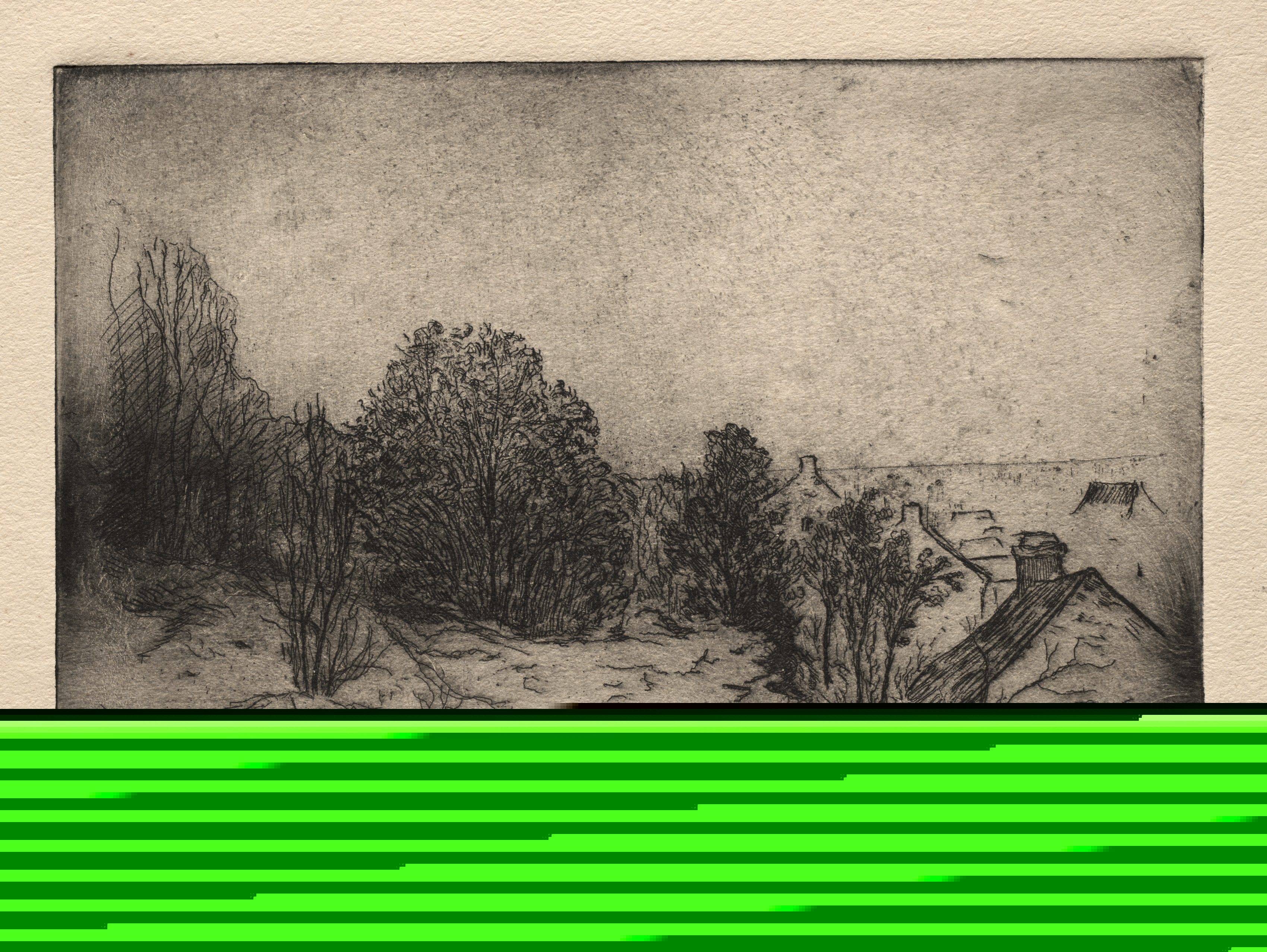 The image depicts a landscape scene. A small house with a chimney and sloping roof is on the right side. Bare trees and bushes are scattered throughout the scene. The background features more houses and trees in the distance. The sky above appears overcast. The artwork is rendered in black and white with a gray tone. A beige border surrounds the image. A small logo or monogram is at the bottom center. The overall style suggests an etching or engraving technique.