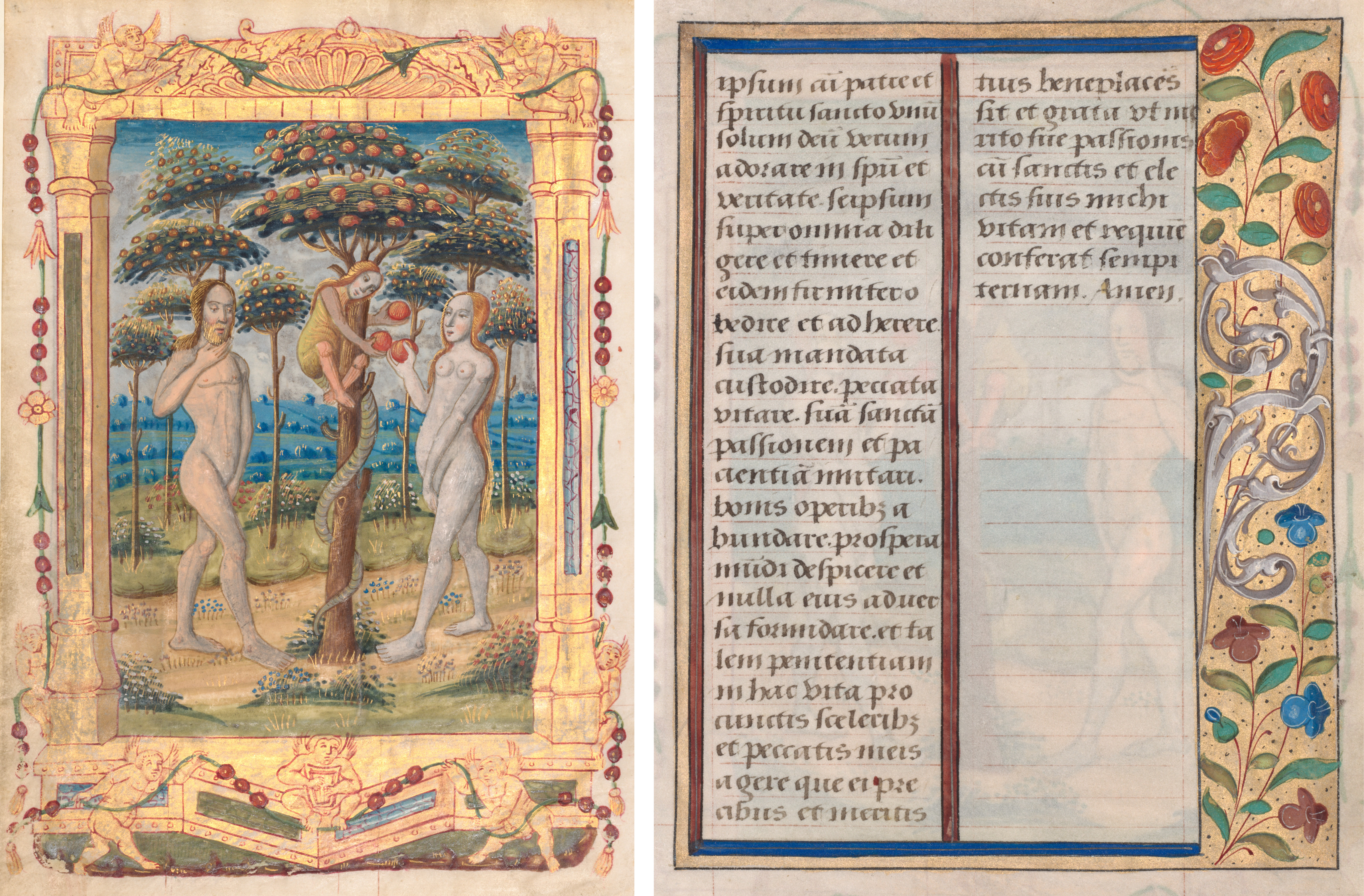 Leaf from a Book of Hours: Adam and Eve and the Fall of Man (Prefatory Miniature to the Office of the Virgin) (recto) and Text with Illustrated Border (verso) (1 of 3 Excised Leaves)