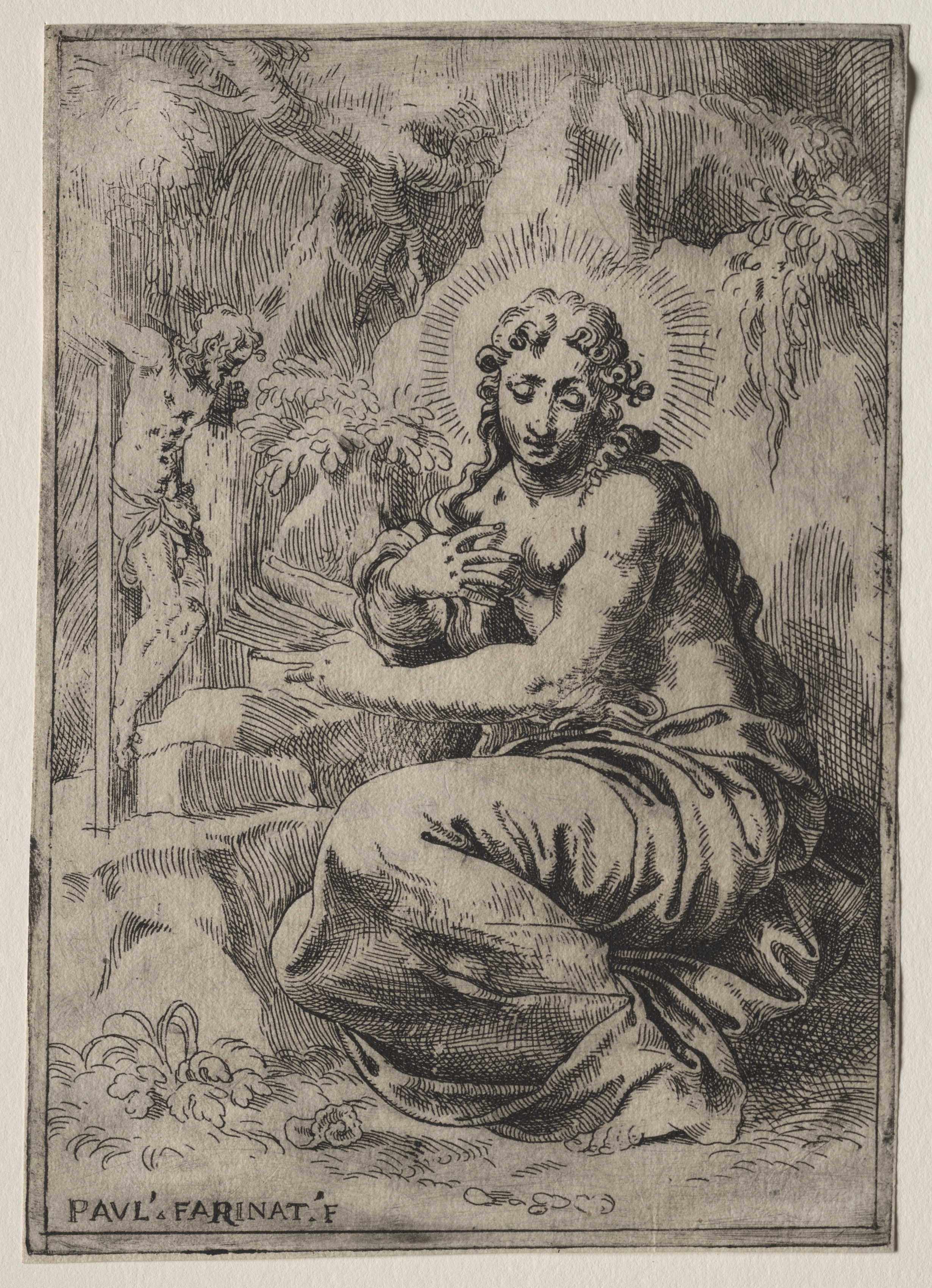 Black and white engraving of a seated woman with curly hair and a halo. The woman wears a long dress. She sits on a rock, surrounded by foliage, and holds a skull. Behind her is a crucifix. The cloudy sky and foliage are detailed in the background. The artist's signature "PAVL.FARINAT.F" is visible in the bottom left corner. The overall composition depicts a somber, reflective scene. The subject is The Magdalen, created by Paolo Farinati.
