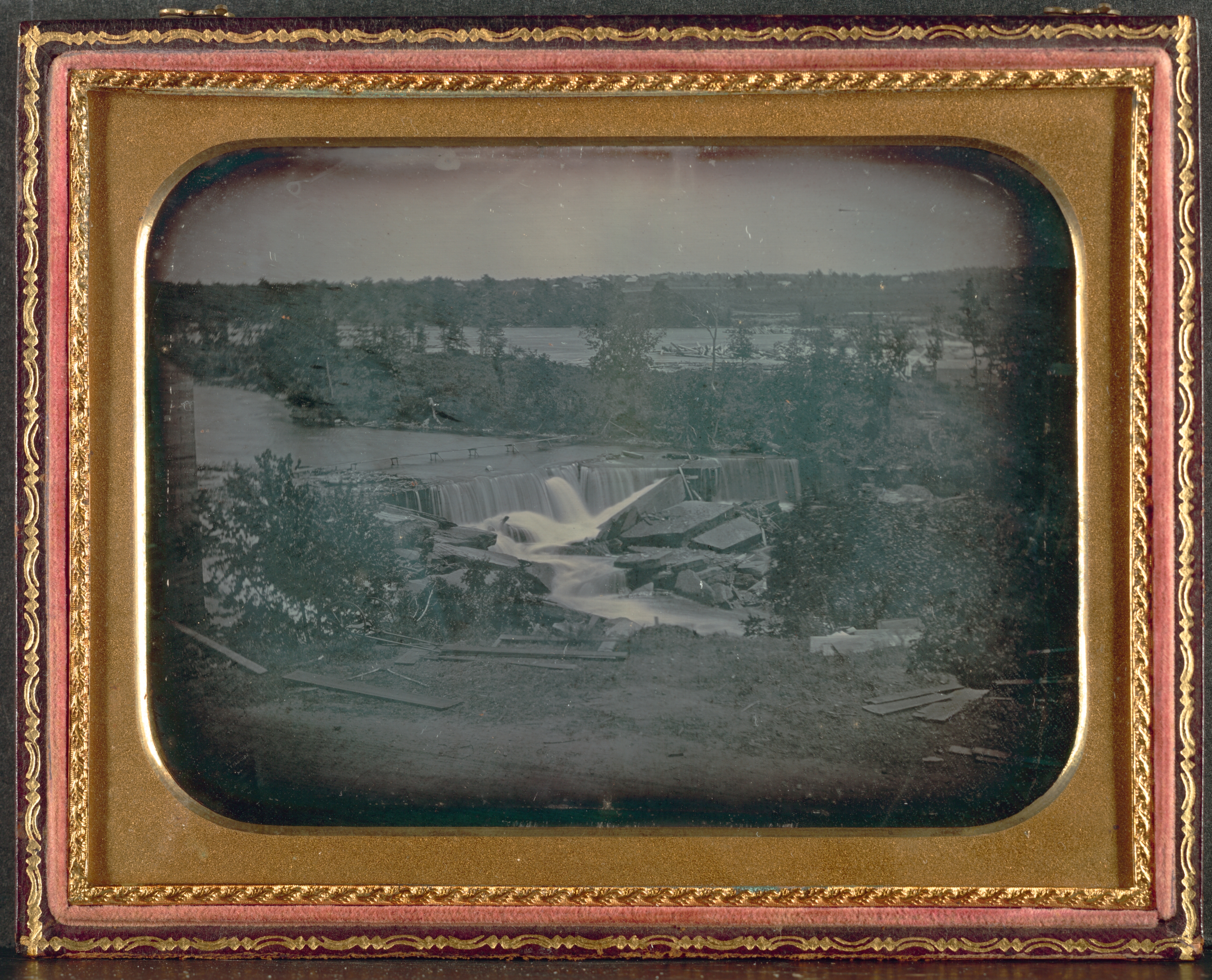 The image shows a framed photograph of a waterfall. The waterfall is wide and short, with a large amount of water cascading over it. The water appears white where it falls. The waterfall is surrounded by trees and other greenery on both sides. A wooden structure or dam is visible at the top of the waterfall. A river or stream continues on both sides of the waterfall. The photograph is in black and white. The frame is gold with a pink border and ornate details. The frame has rounded corners. The background of the image is a landscape with trees and a gray sky. The title of the image is "St. Anthony Falls from Across the River" and the artist is not specified but likely a 19th-century photographer.