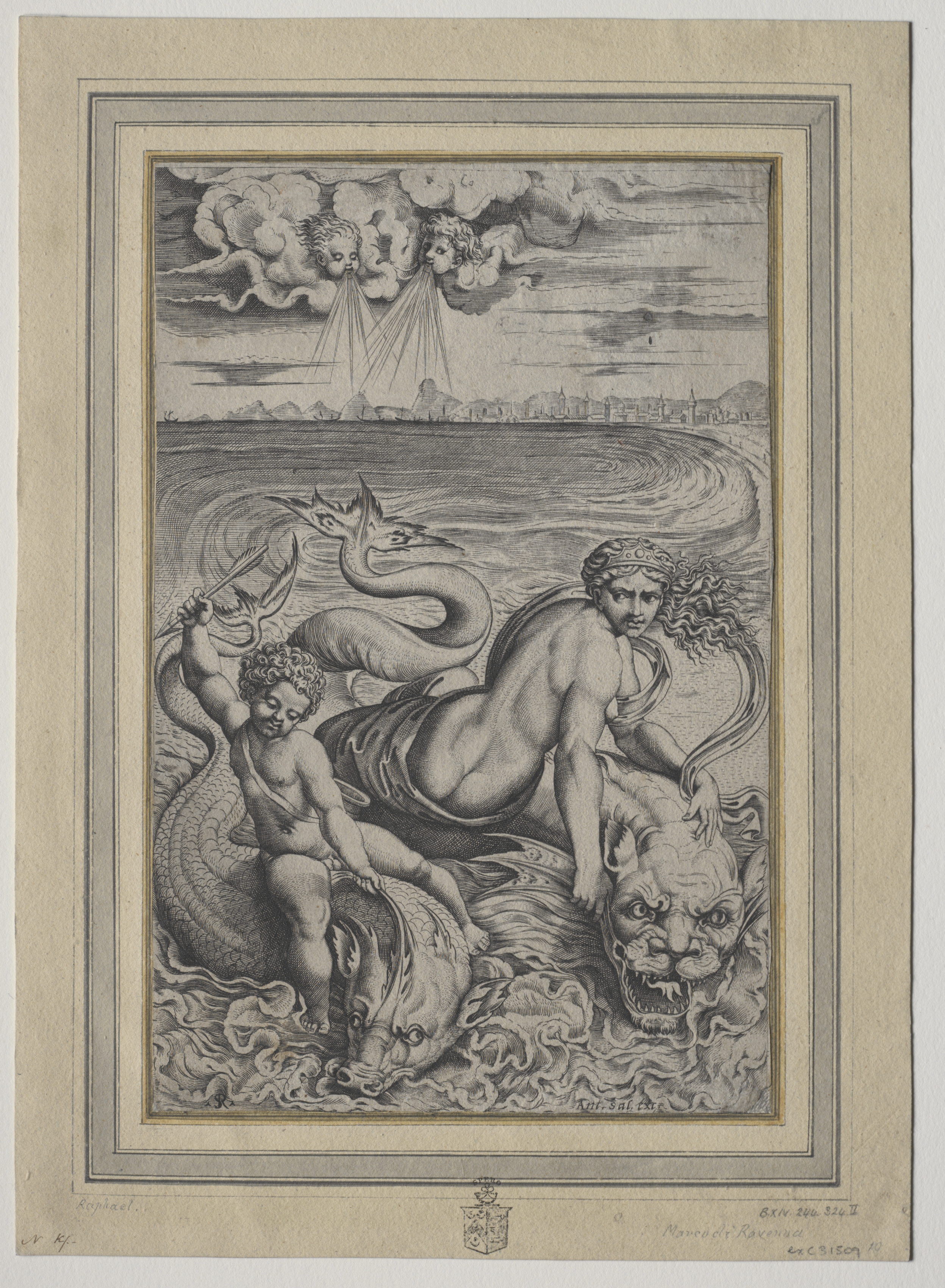 Black and white drawing of a reclining nude woman and a small child on top of a sea monster with a lion-like head and a fish-like tail. The sea monster is surrounded by waves. The woman has her hair flowing behind her and is looking down. The child is holding a bow and arrow. There are buildings and a body of water in the background. A cloudy sky with multiple heads protruding from it is above the woman and child. The drawing is surrounded by a thick beige border with a thin dark line and a thin gold line.