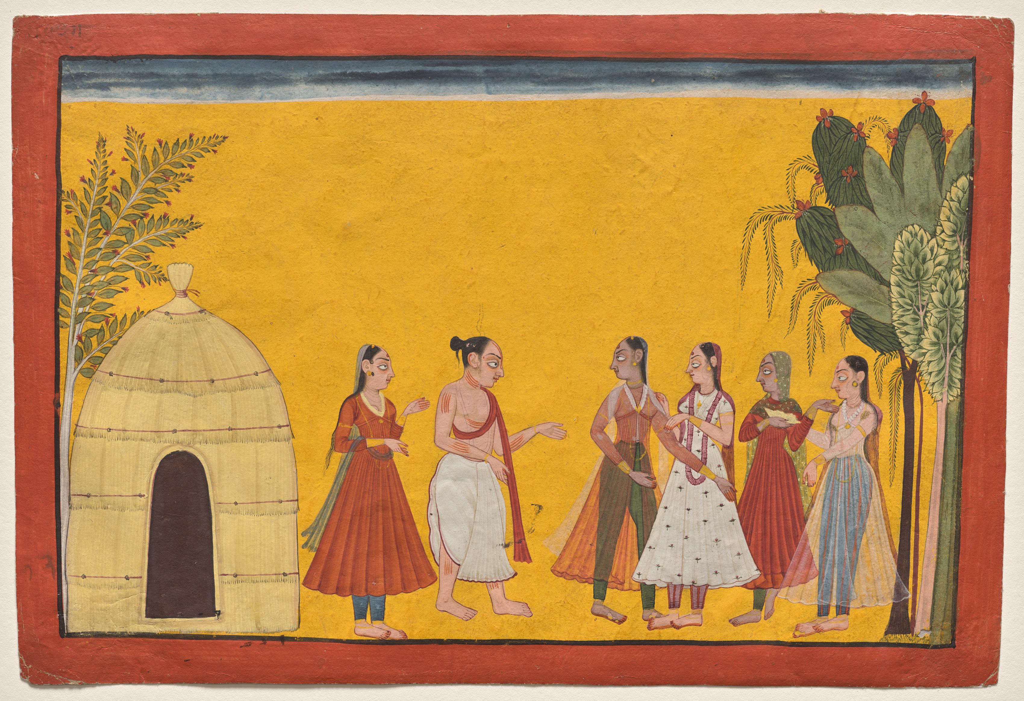 Yellow rectangular artwork with red border, featuring a scene with a domed hut on the left and palm trees on the right. A man in a white dhoti and red shawl stands in center, addressing four women in long dresses; another man stands to his right. The man faces right and one woman holds an object. The background is yellow.