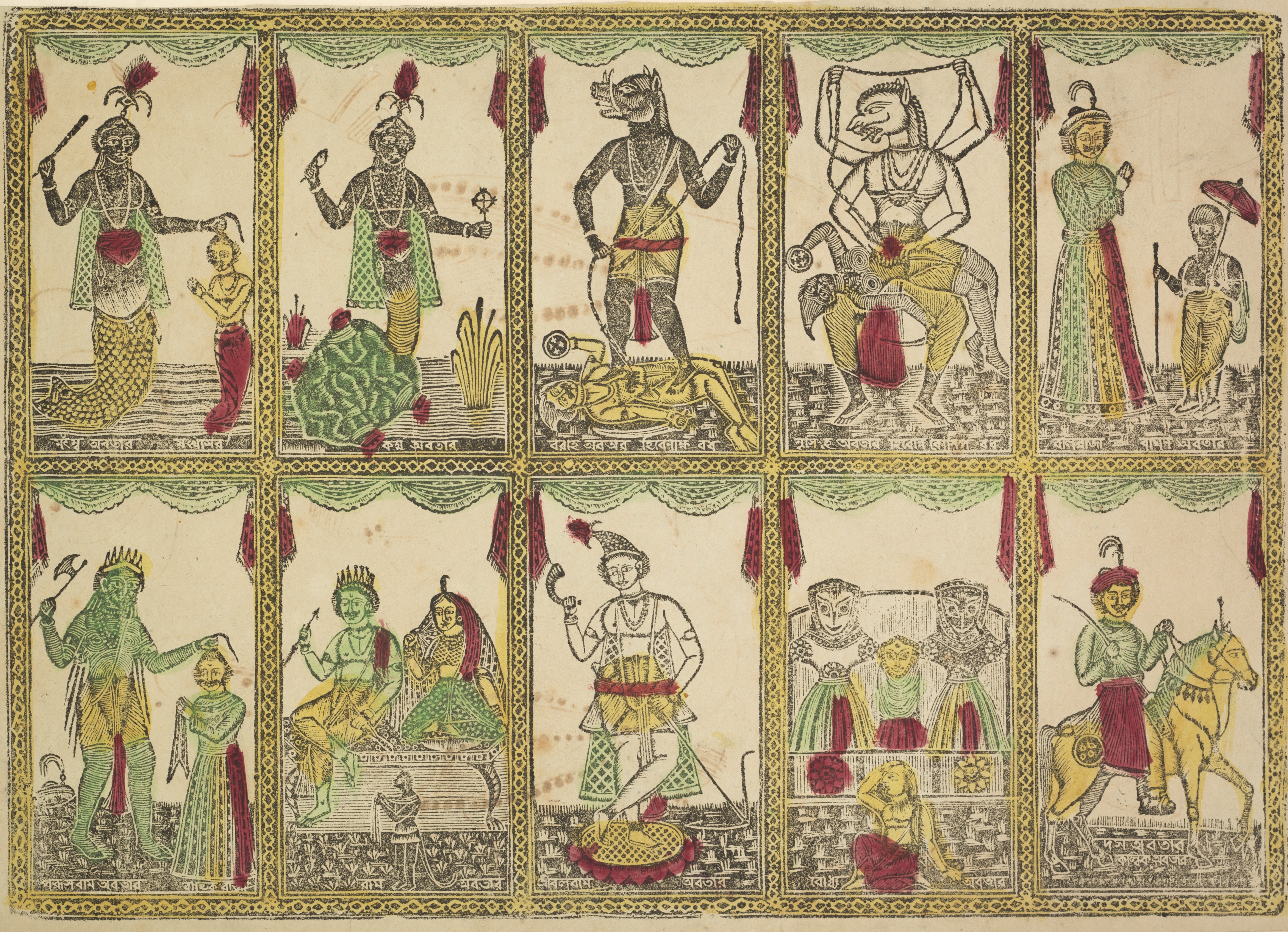 Das Avataras, Ten Incarnations of Vishnu (verso), from a Kalighat album