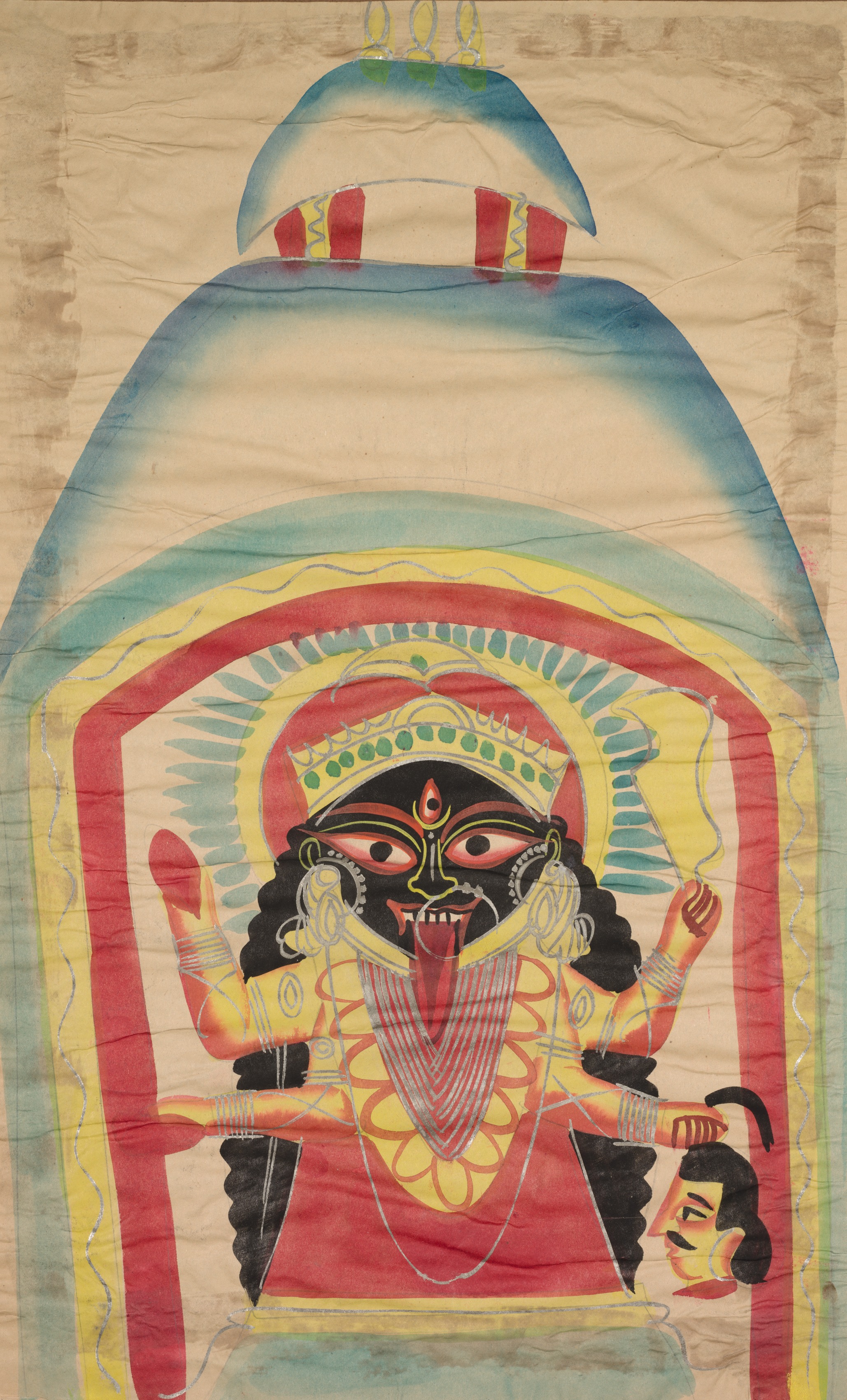 Leaf from a Kalighat album: The Goddess Kali (recto); Kali Standing on Shiva (verso)