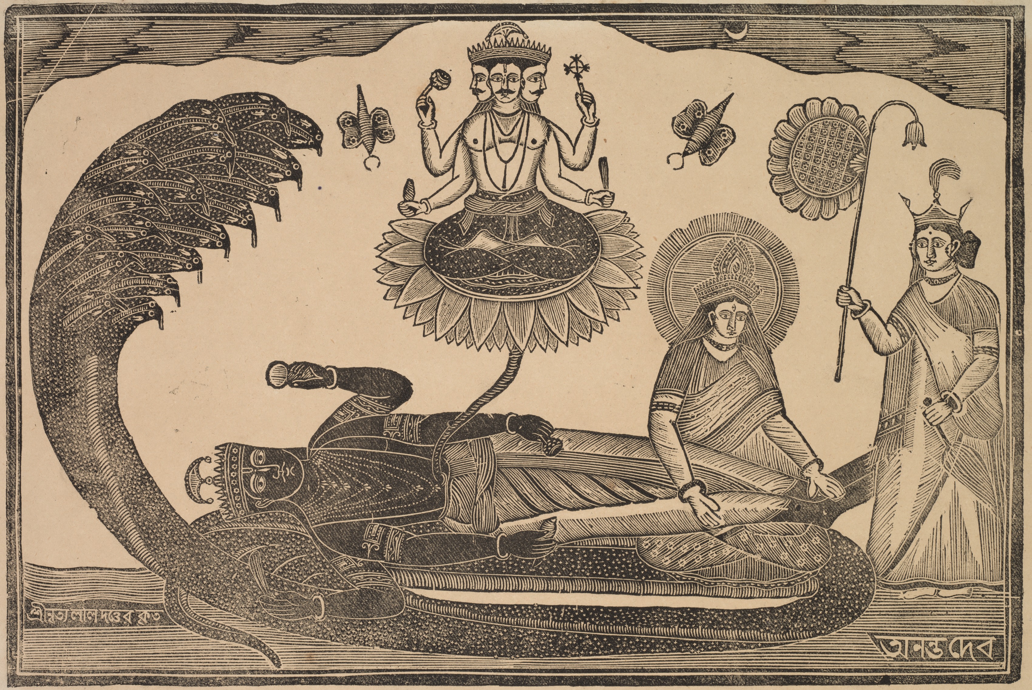 Black and white drawing of a scene with four figures. A large snake-like creature with multiple heads lies on the ground. A man sits on top of the snake. A four-armed figure sits on a lotus flower above. A fourth figure stands to the right. The background is a light color.