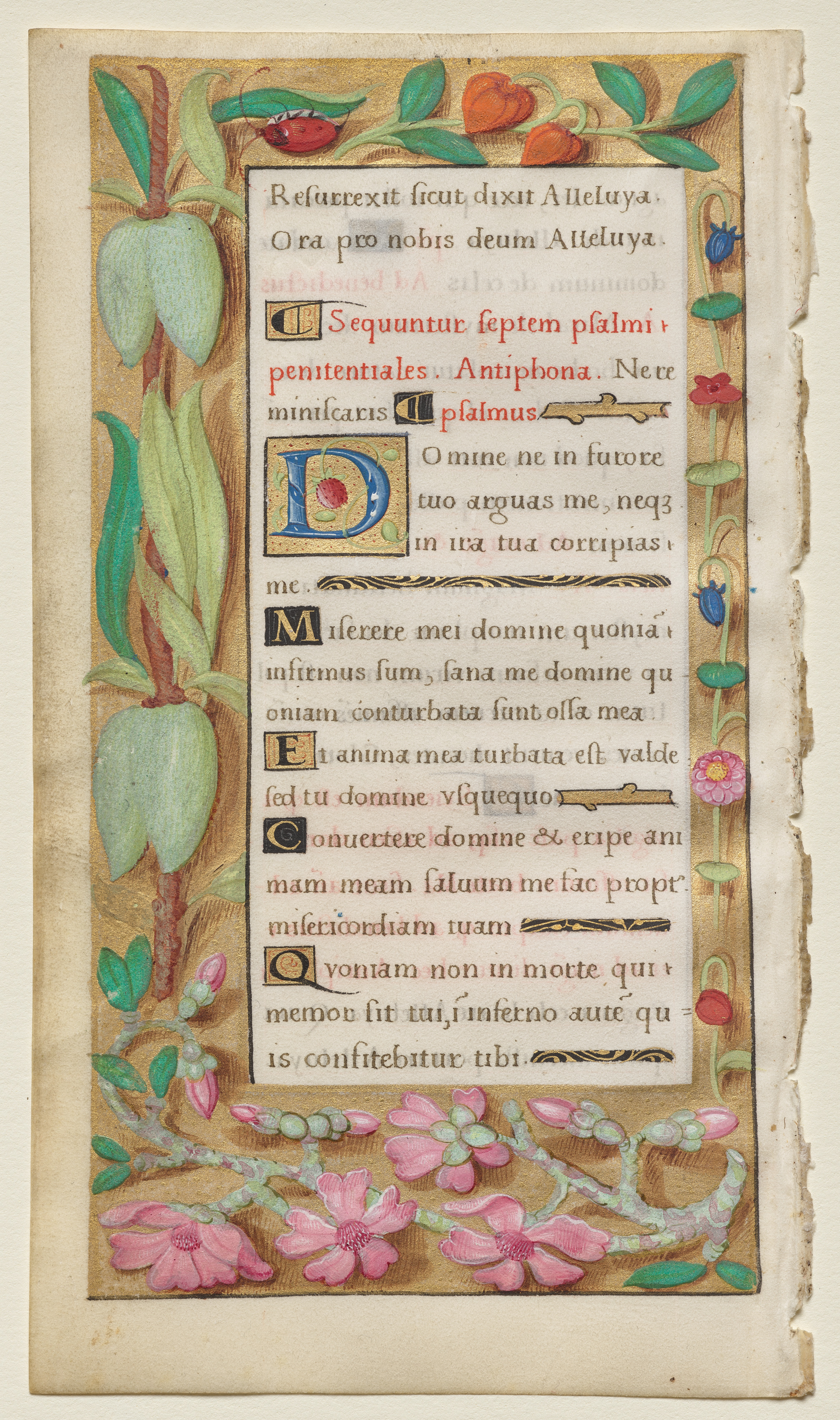 The image depicts a medieval manuscript page with a border of flowers and leaves. The border features green leaves, pink flowers with green stems and leaves, blue flowers with yellow centers, and pink buds. The border is on a beige background with rough, uneven edges. Inside the border is a white rectangle containing black, red, and blue text in a language that appears to be Latin. The text is arranged in paragraphs with some words or letters larger than others. The large blue "D" has a yellow and red design inside it. The page has a beige background. The text and artwork are from a Book of Hours, specifically the Penitential Psalms by Noël Bellemare.