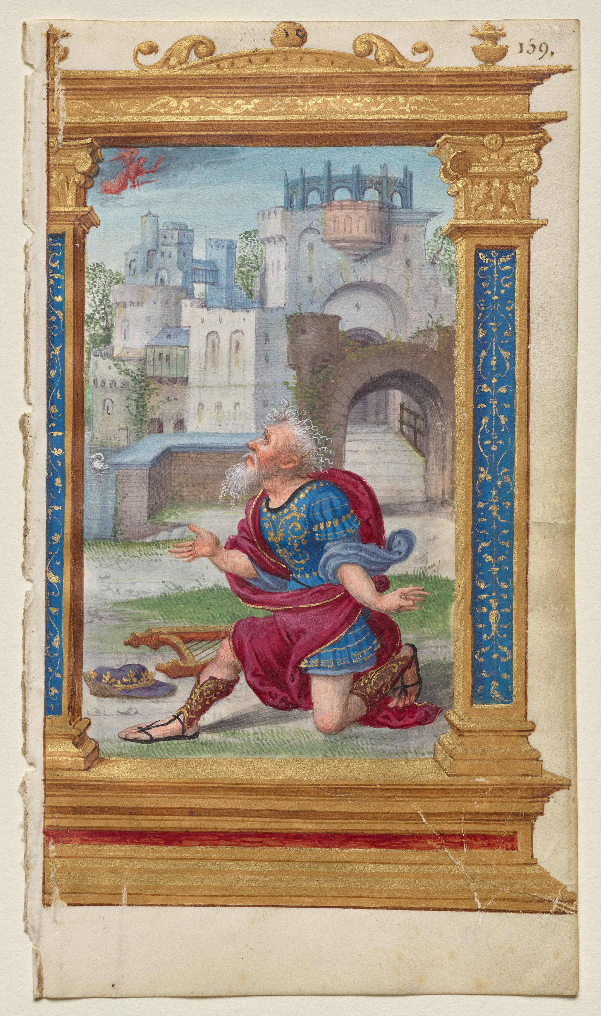 A man with white hair and a beard kneels on one knee, hands outstretched, wearing a red cloak over a blue tunic with gold accents and gold and red knee-high boots. A harp lies on the ground beside him. He is within a gold frame with blue and gold accents. The background shows a castle and a bridge. The man appears to be looking up at a red wing or object in the sky. The scene is bordered by off-white.