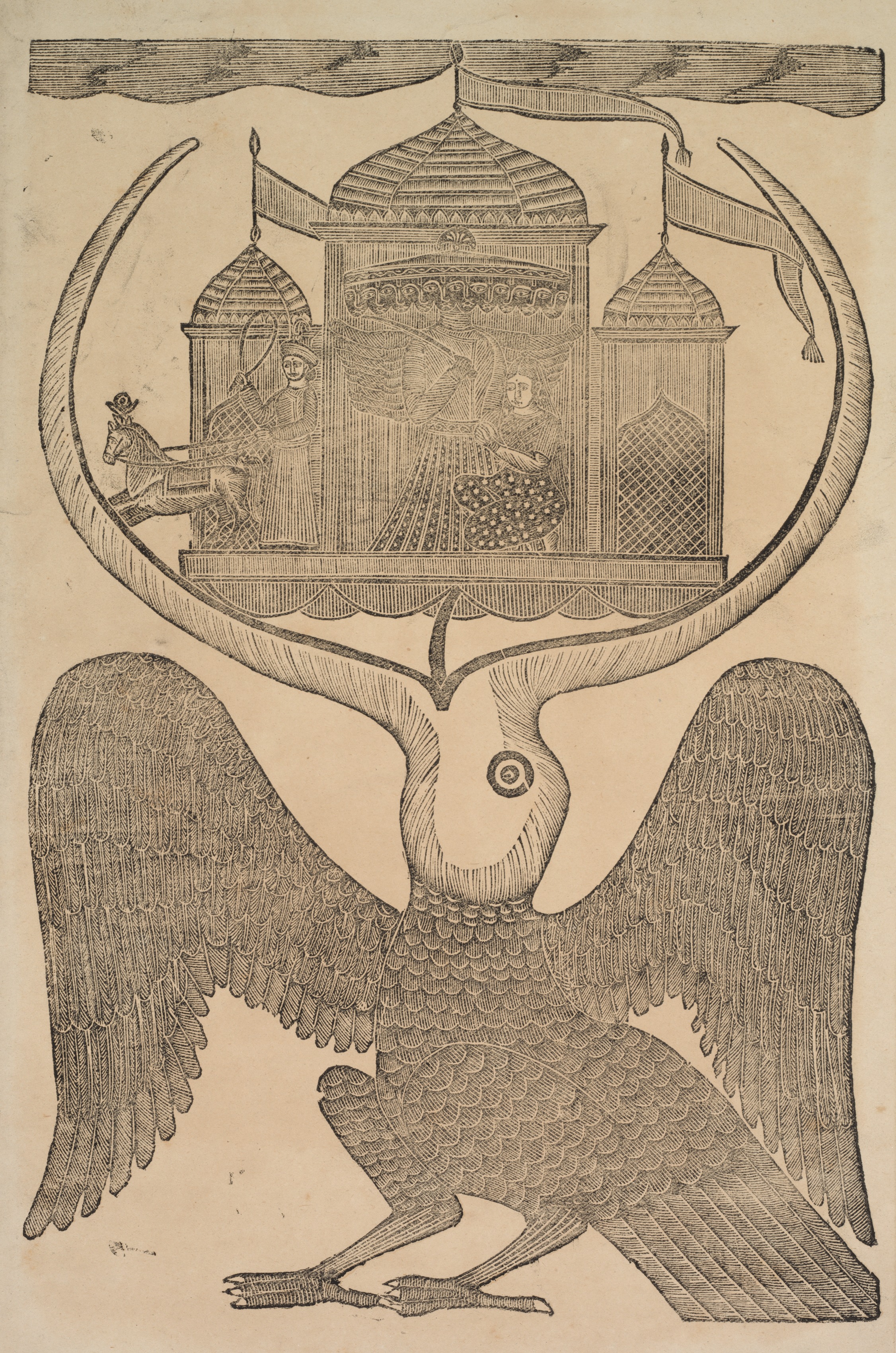 Black and white drawing on beige background. A large bird with spread wings and sharp talons faces a chariot. The bird has one leg bent, the other straight. Its head has a round eye and a curved beak. The chariot has a horse, a driver, and three people inside. The chariot is surrounded by a semi-circle. The building has a pointed roof in the center flanked by two smaller ones. The building also features small decorative domes and flags on top.