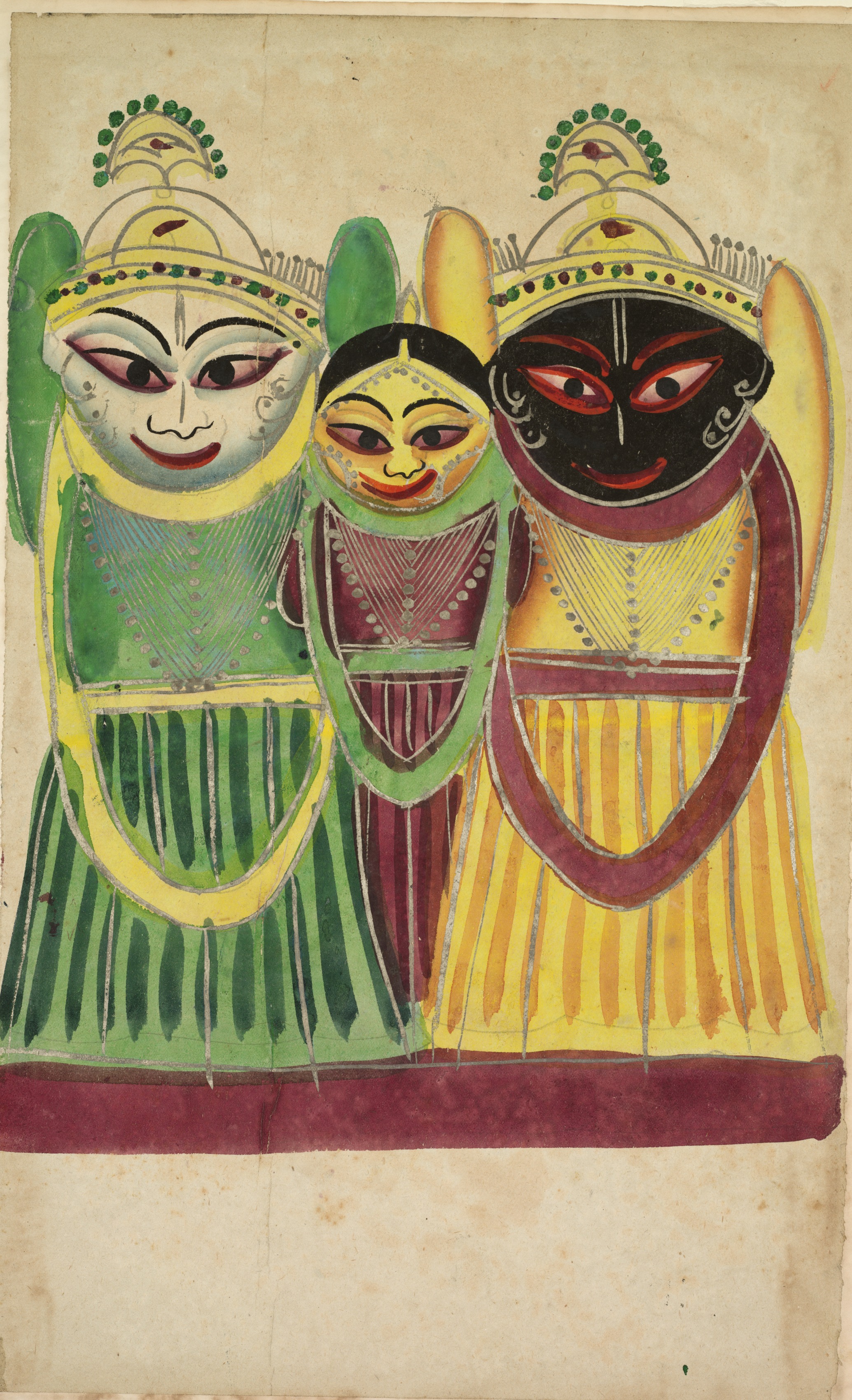 The verso side of the Jagannatha Trio depicts three individuals with elaborately designed face paint and headdresses. The individual on the left has white face paint, adorned with a red bindi between their eyebrows, pink around their eyes, and red lipstick. They wear a green and dark green striped dress with yellow trim. The middle individual has yellow face paint with pink around the eyes and red lipstick; their hair is black. They wear a maroon and yellow dress with green trim. The individual on the right has black face paint with red around the eyes and red lipstick; they also wear a yellow and orange striped dress with maroon trim. All three individuals are adorned with a similar yellow headdress, with green decorative circles along the top and red and green gems around the base. The background is a plain beige color with darker edges.