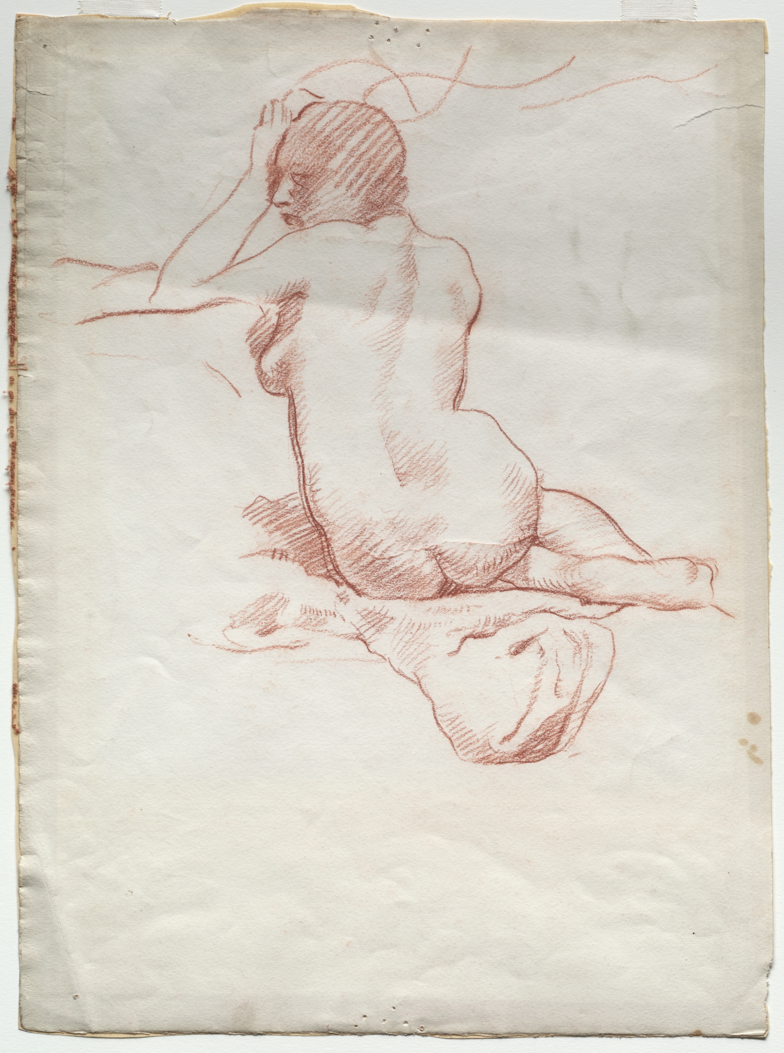 Red chalk drawing on aged, off-white paper with darker edges. A nude woman sits on a surface, viewed from behind. Her knees are bent and her right hand touches her head. Her left arm rests on her upper leg.