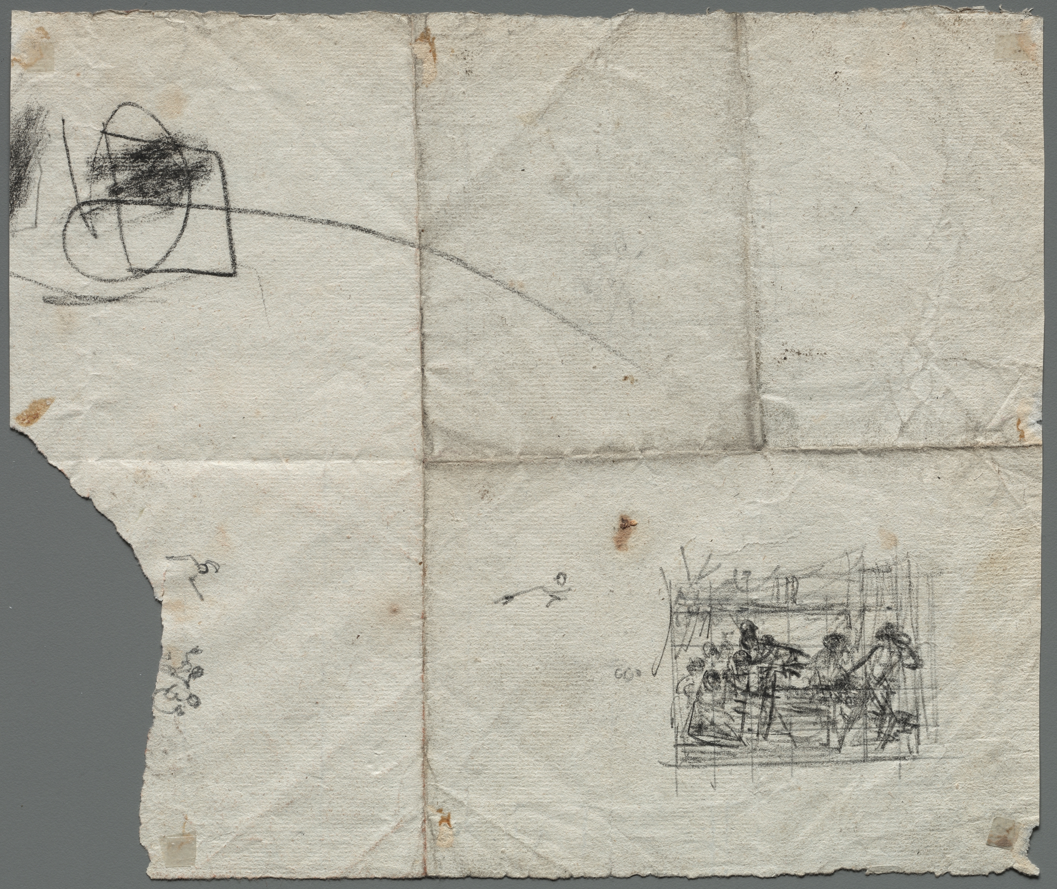 The image shows a piece of aged paper with visible creases, stains, and tears. The paper is off-white with a rough texture. It appears to be folded into four sections. In the top left corner, there is a black scribble that resembles a rough sketch or a signature. A curved line extends from the scribble to the center of the paper. In the bottom right corner, there is a small sketch of several people gathered around what appears to be a table or platform. The sketch is done in black and appears to be a rough composition. The edges of the paper are rough and torn in some places, with small pieces missing. The background behind the paper is solid gray.