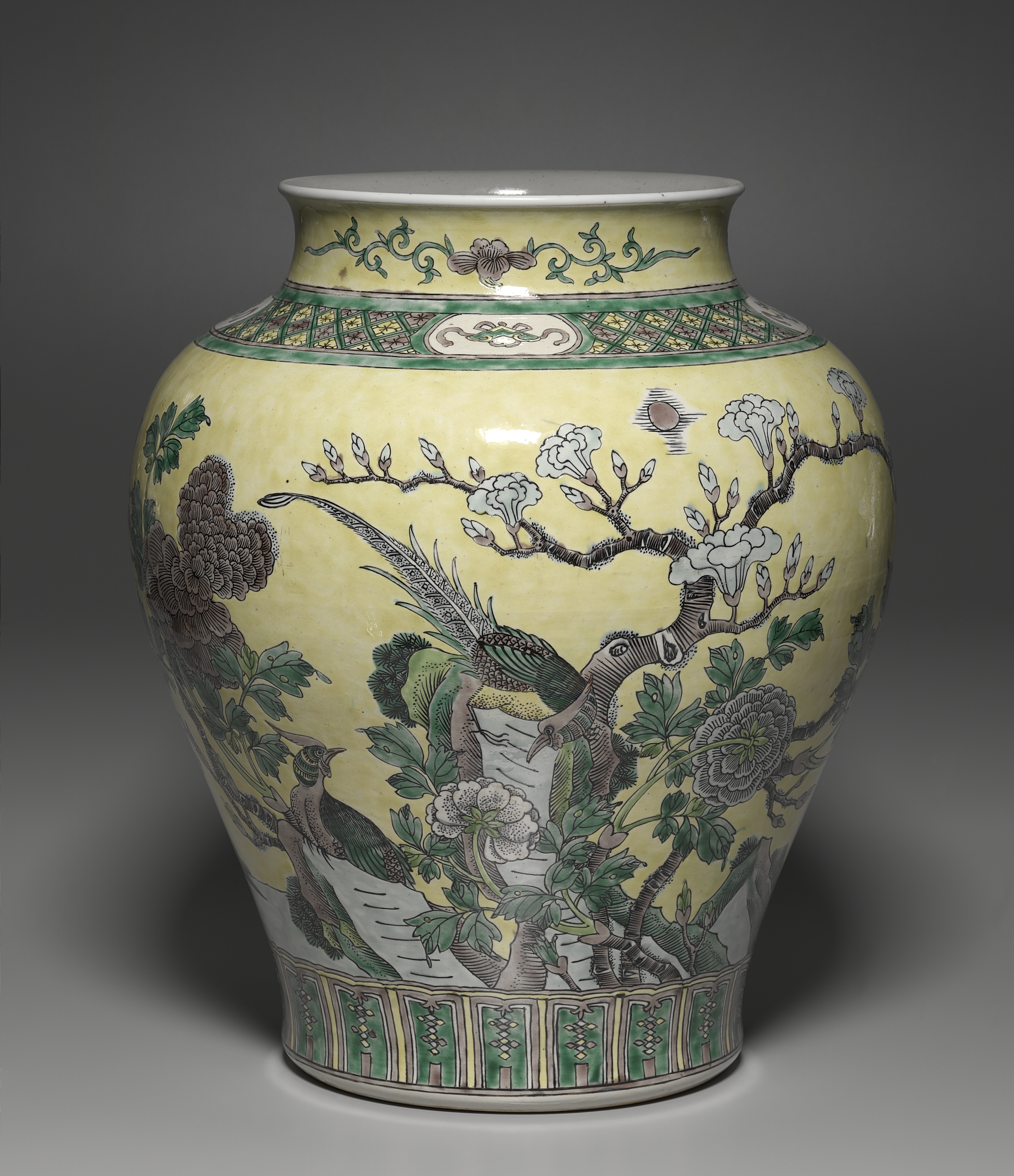 The image shows a large, yellow vase with a wide mouth and a narrow base. The vase has a green and yellow decorative band around the top and bottom. The body of the vase features a design with two pheasants, one on a tree stump and the other on a lower branch. The vase also depicts several types of flowers and foliage. The background of the image is a gradient from dark gray to light gray. The artwork title is "Jar with Flowers, Rocks and Pheasants".