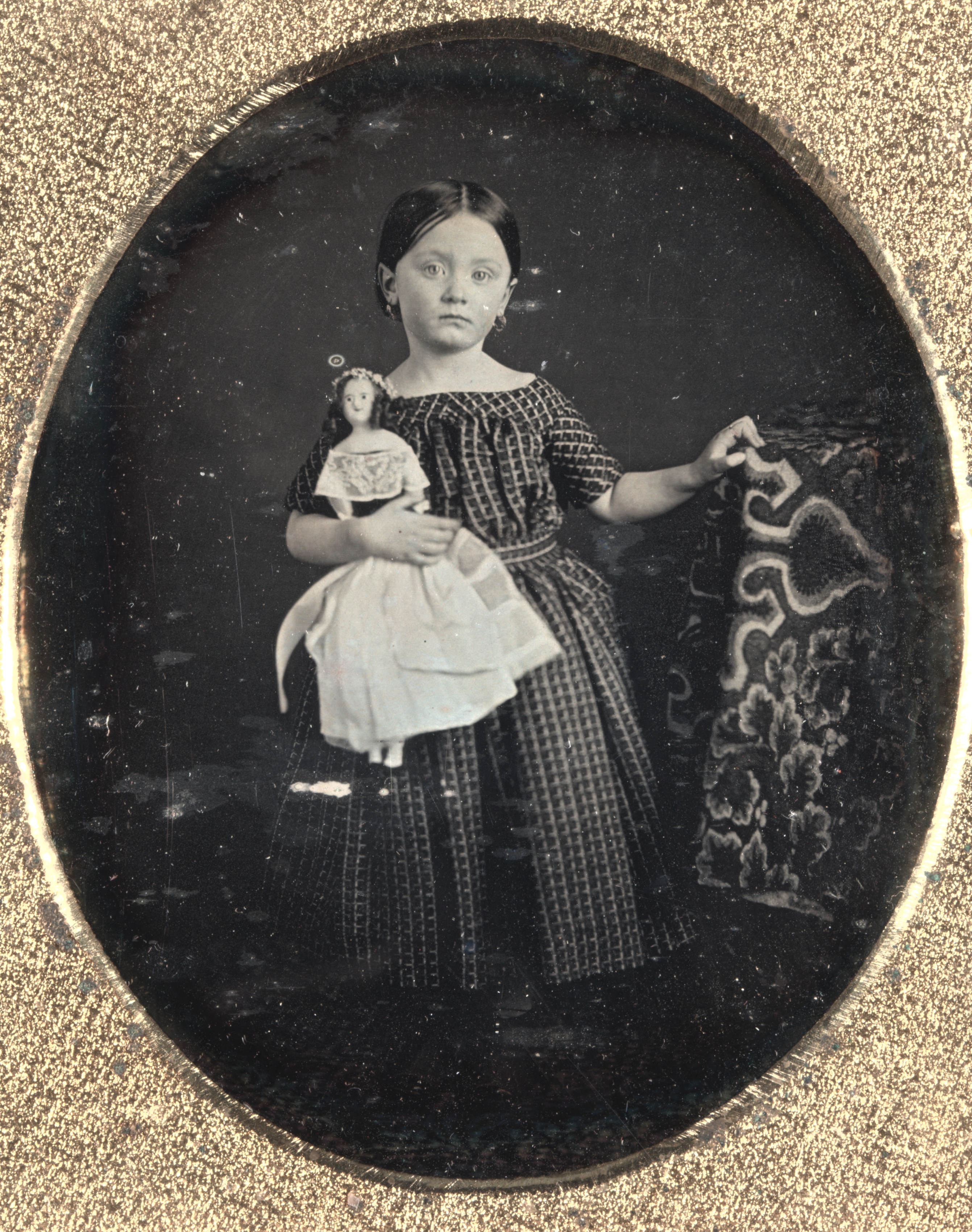 Black and white oval-shaped photograph of a young girl with a doll. The girl is wearing a dark dress with a white checkered pattern and a white apron over it. Her dark hair is parted in the middle and pulled back. She is holding a porcelain doll with a white dress in her right hand. The girl's left hand is resting on a patterned fabric, possibly a curtain or upholstery. The background of the photograph is dark. The photograph has a textured gold-colored frame. The title of the photograph is "Girl with Doll".
