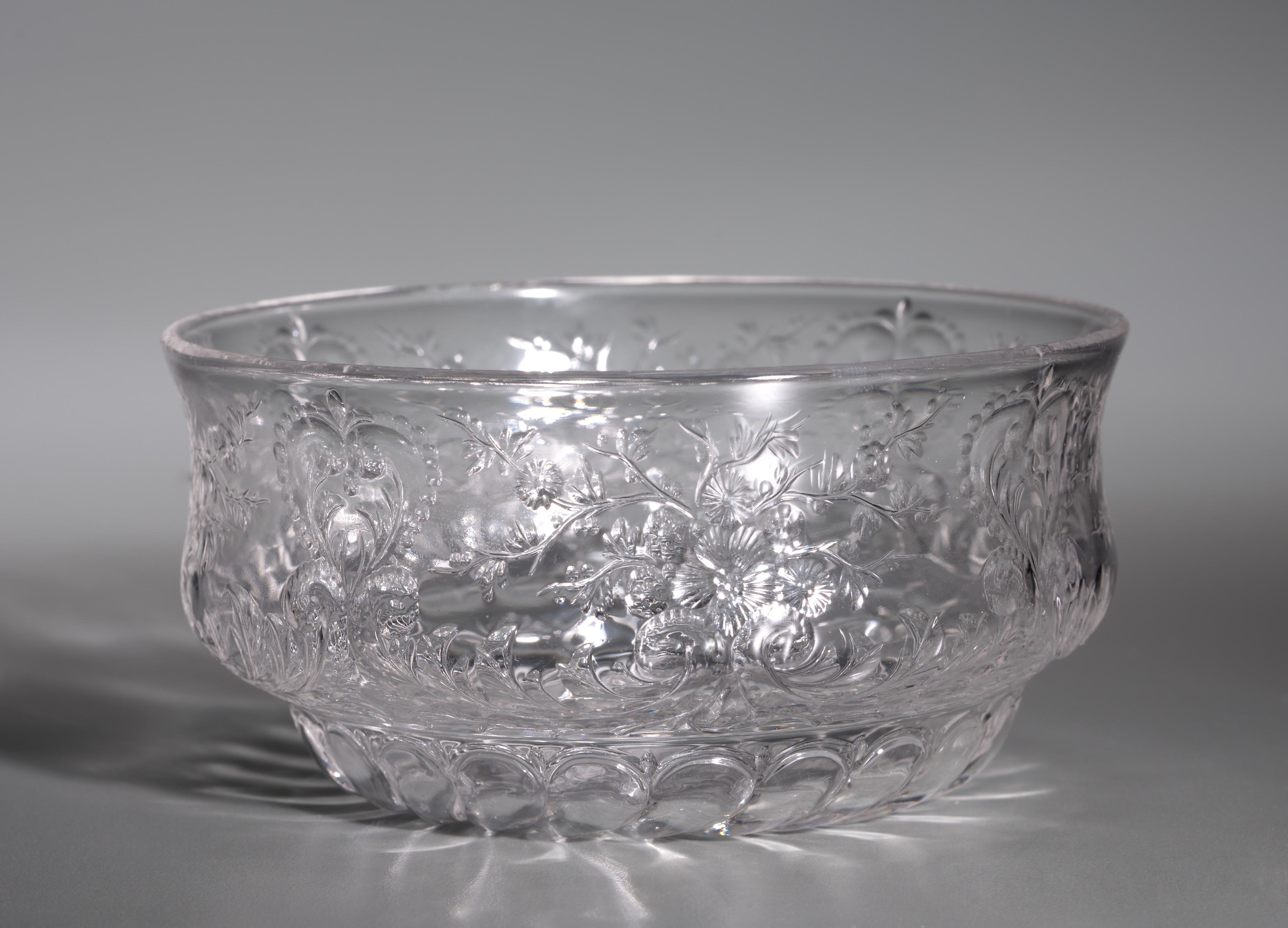 Clear glass bowl with floral etchings. The bowl has a wide mouth and a rounded body. The body features an etched floral design. The base of the bowl has a series of rounded indentations. The bowl is sitting on a reflective surface, casting a shadow to the left. The background is a gradient gray. The bowl by artist is titled "Bowl from a Place Setting".