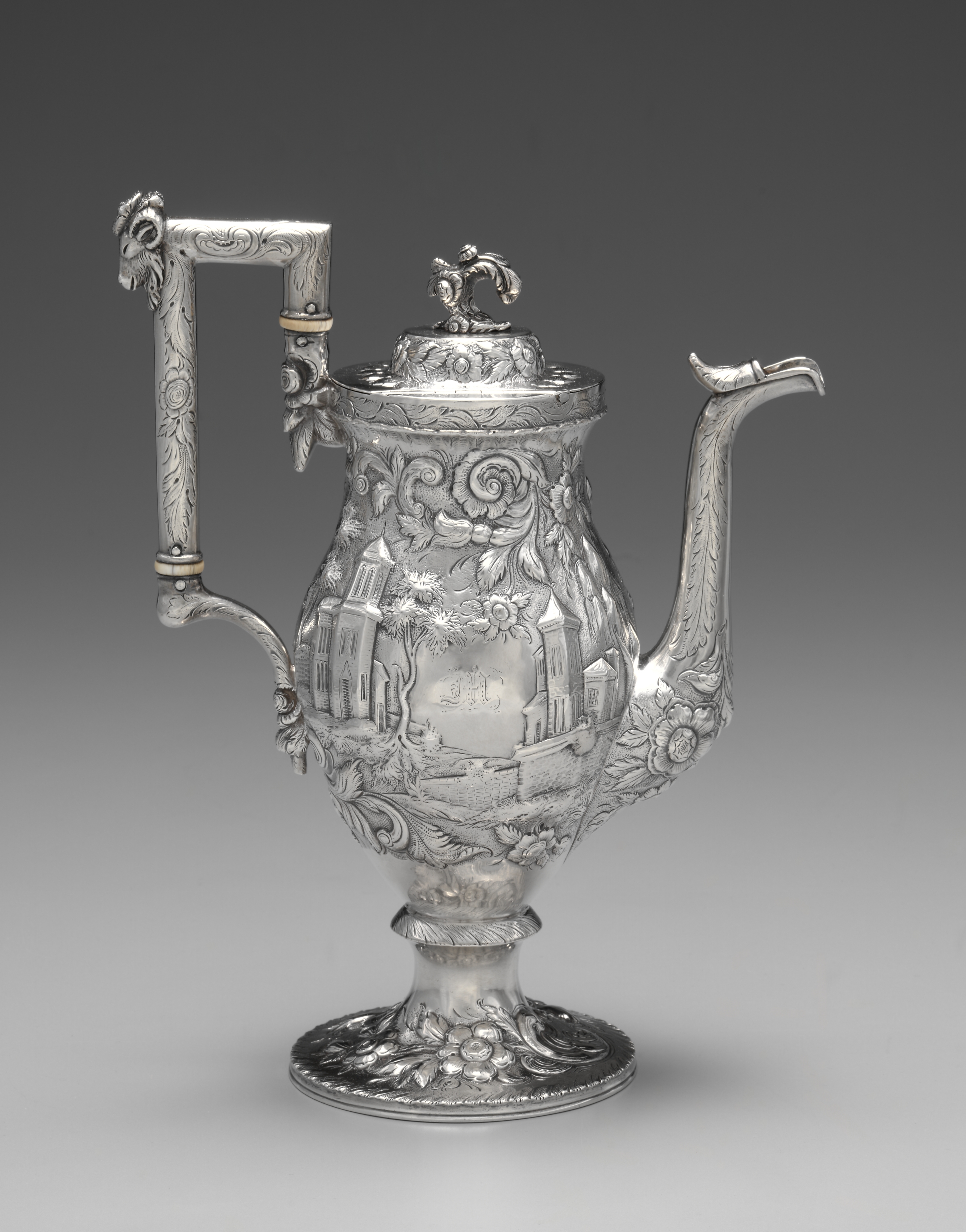 Neo-Rococo coffee pot by Samuel Kirk. Silver coffee pot with a round base and a short stem that widens to a round body with a short neck. The body features scenic engravings. A curved spout protrudes from the right side, while a handle extends from the left. The lid features a decorative finial. The entire surface exhibits intricate designs, including flowers and leaves. The handle is adorned with two ivory spacers. The coffee pot sits on a grey background.
