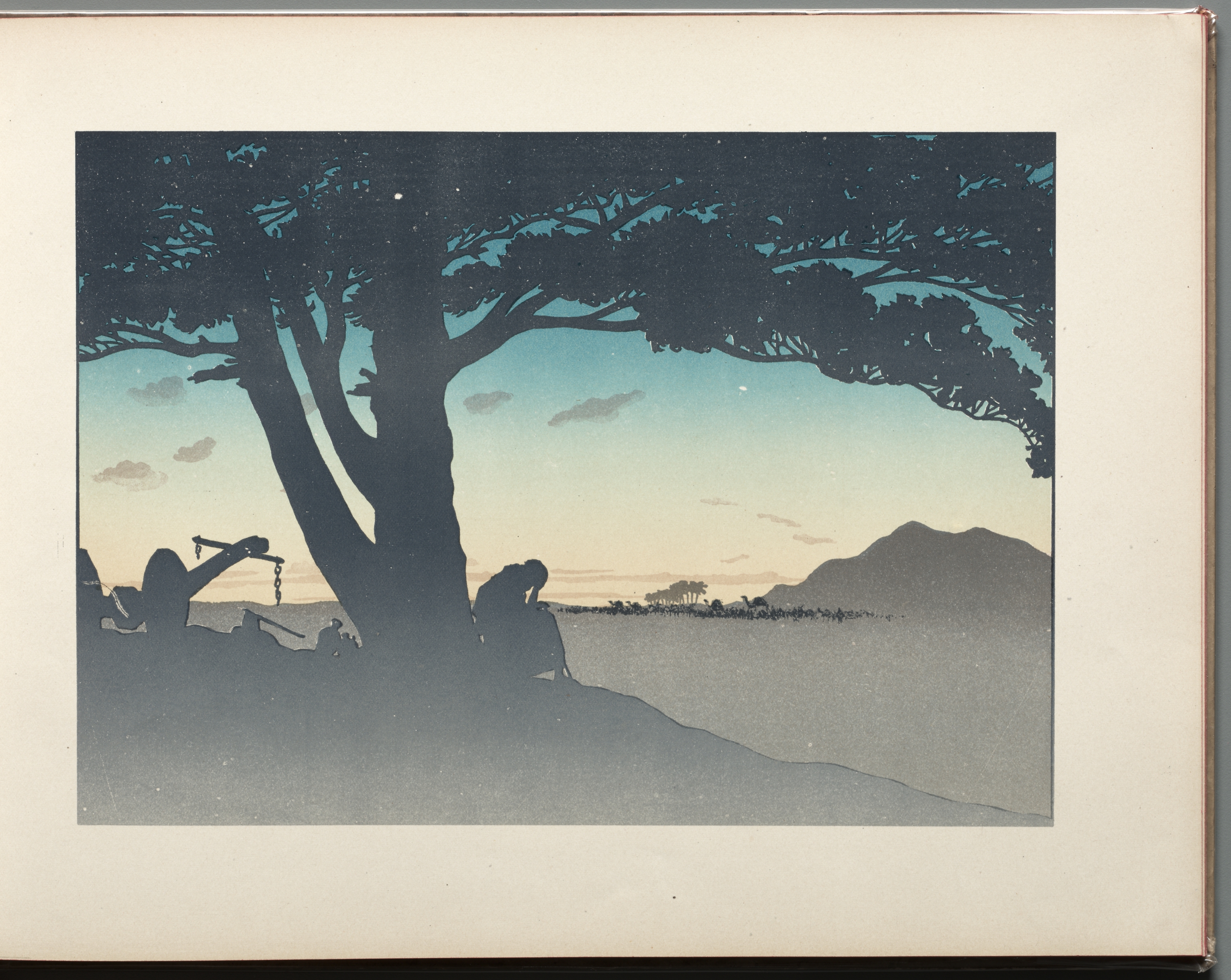 The Prodigal Son: page 17 by Henri Rivière. A person sits on the ground under a tree. They are on a bank overlooking water with a mountain and small trees in the background. Their head is slumped down. A wheelbarrow-like object with a chain attached rests on the ground. The background shows a sunset sky with clouds. The colours are predominantly shades of blue, grey, and brown. The image is in a white mat.