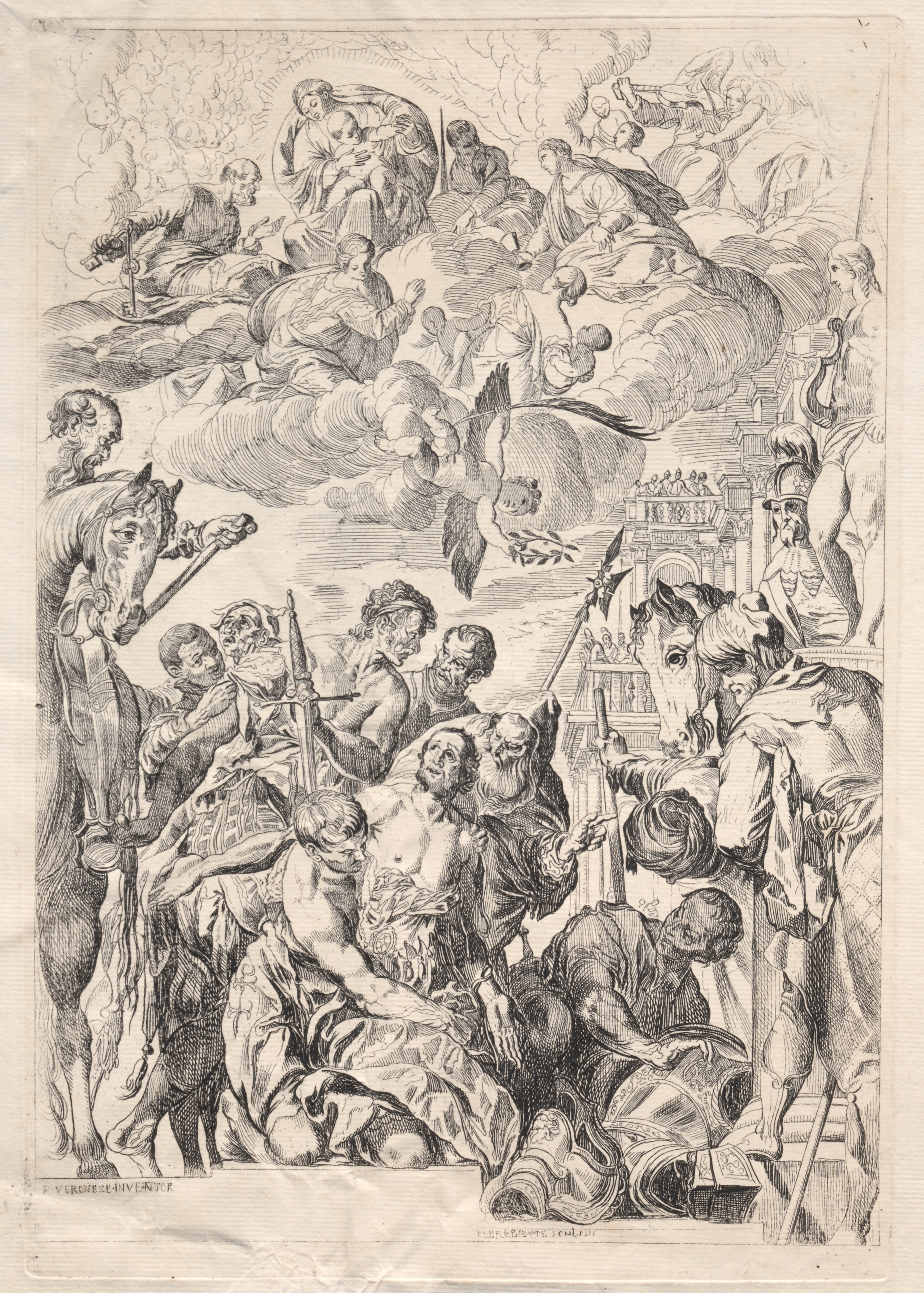 The image depicts a black-and-white drawing of a chaotic scene with many figures. A man on horseback wearing a helmet and holding a spear or pole is on the right. The horse faces left. A man on foot wearing a helmet and holding a spear or pole is on the left. The horse faces right. A crowd of people surrounds the horses; some on the ground, some on their feet; some appear to be dead, and some are alive. Some are holding weapons. At the top, people are sitting on clouds; some are surrounded by haloes. A bird flies in the center. There are buildings in the background.