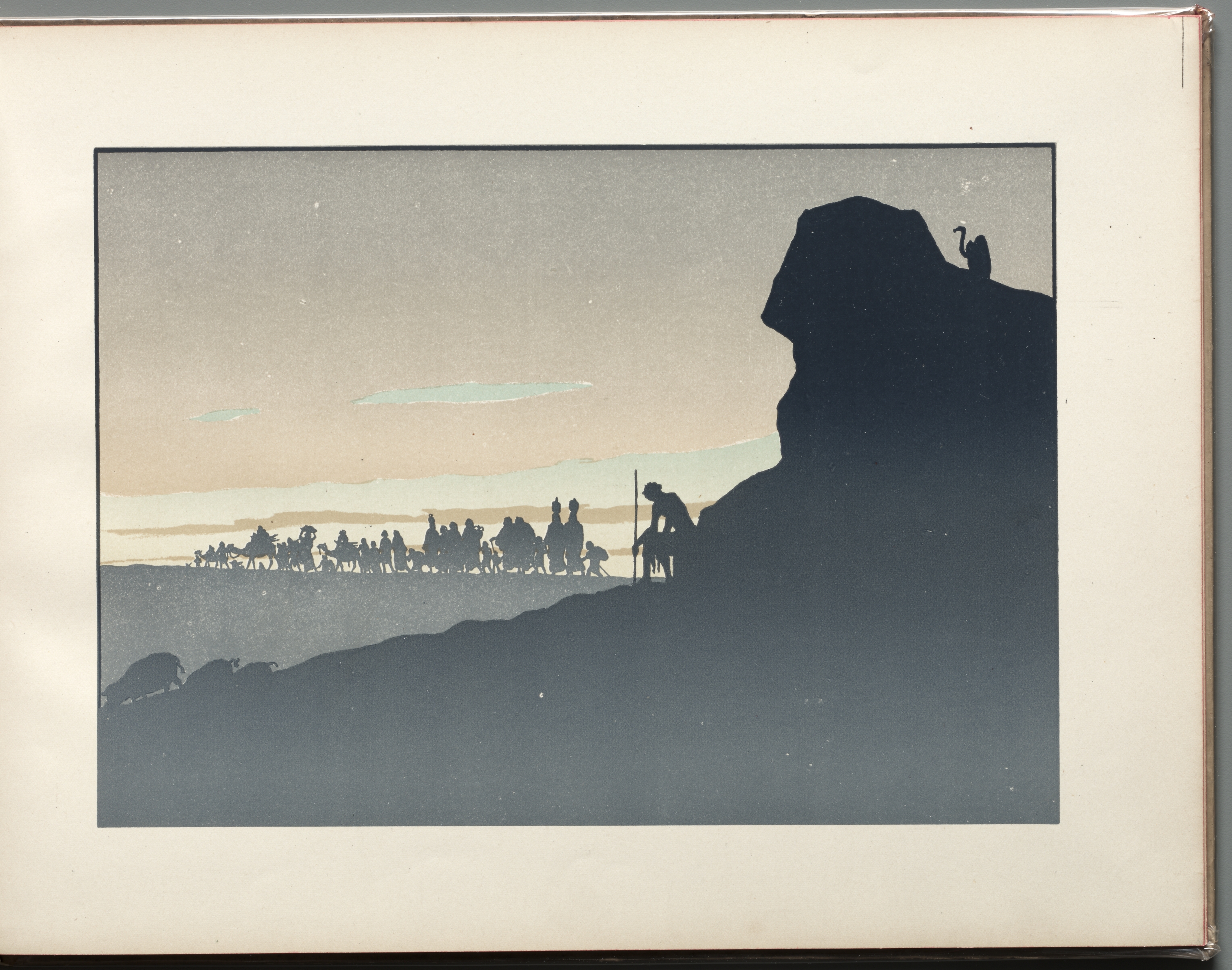 The Prodigal Son: Cinquième Tableau by Henri Rivière. A framed artwork depicting a landscape with a large hill on the right side and a group of people with animals on the left. The hill on the right is dark and takes up half of the artwork. The people and animals on the left are shown as silhouettes. The sky has hues of pink and blue. The frame is off-white with a thin black line around the artwork. The artwork is rectangular.