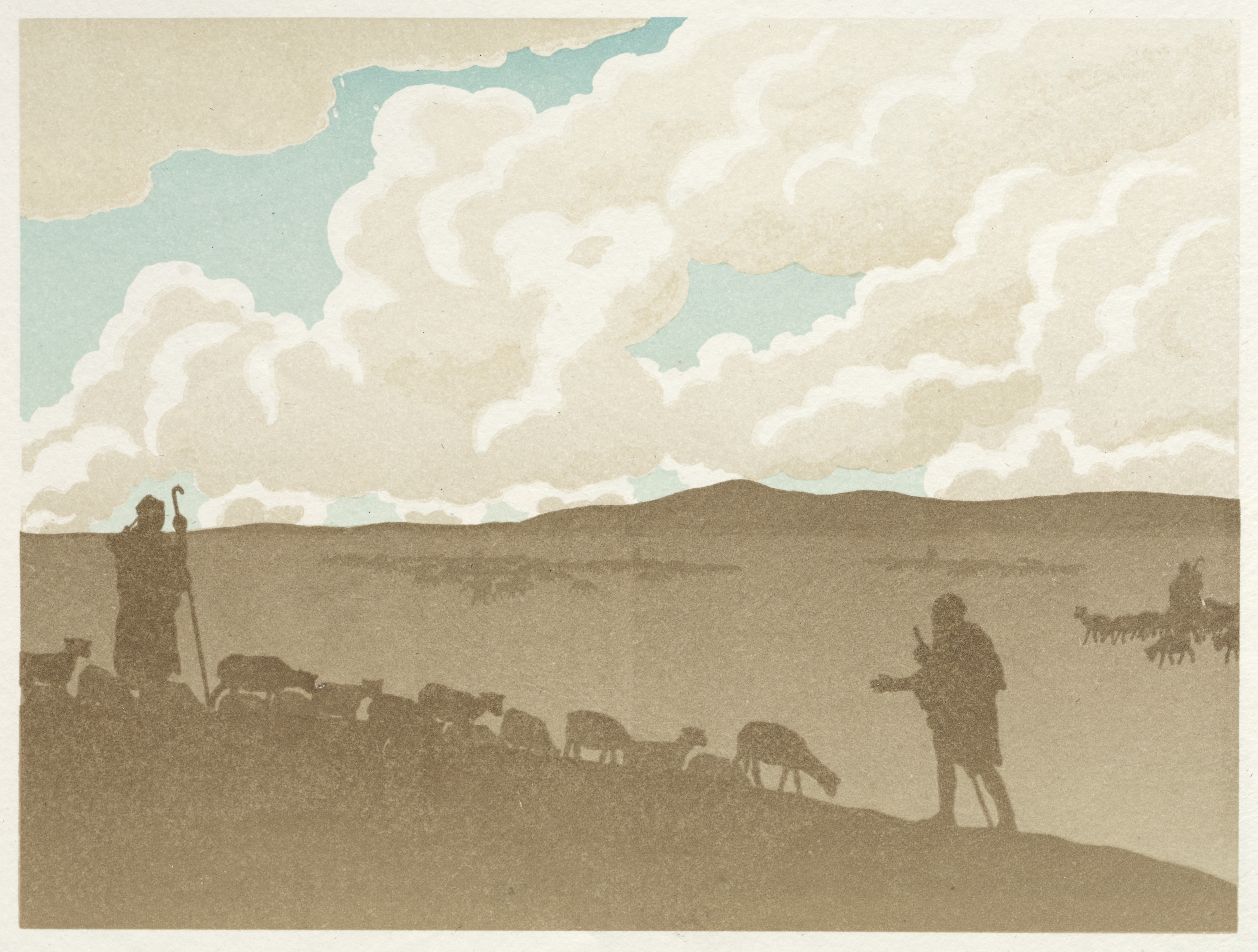 Brown and white image of a pastoral scene. A man stands on the left side of the image with a shepherd's staff in one hand. He wears a long dark robe and a hat. A flock of sheep surrounds him. On the right side, another man stands with a dog. Farther right, a person on horseback leads a pack of dogs and another flock of animals. The sky is light blue with large white and beige clouds. The image depicts a vast open landscape with low hills in the background. The title of the image is "The Wandering Jew: The Plain" by Henri Rivière.