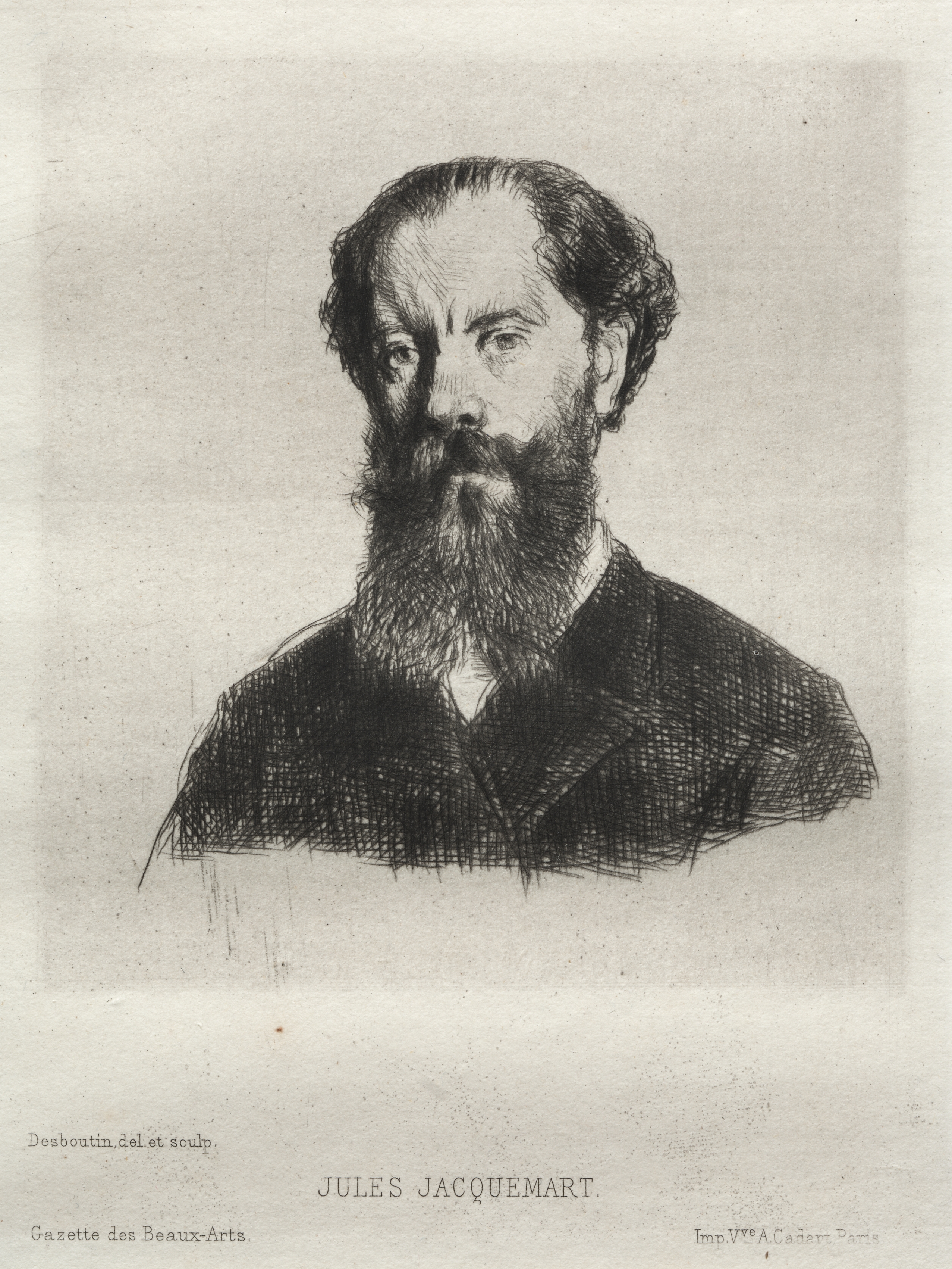 Black and white sketch of a man with a beard and mustache. The man has dark hair that is combed back. He wears a dark jacket with a white collar. The background is light gray. The image is labeled "JULES JACQUEMART" at the bottom. Additional small text is present at the bottom.