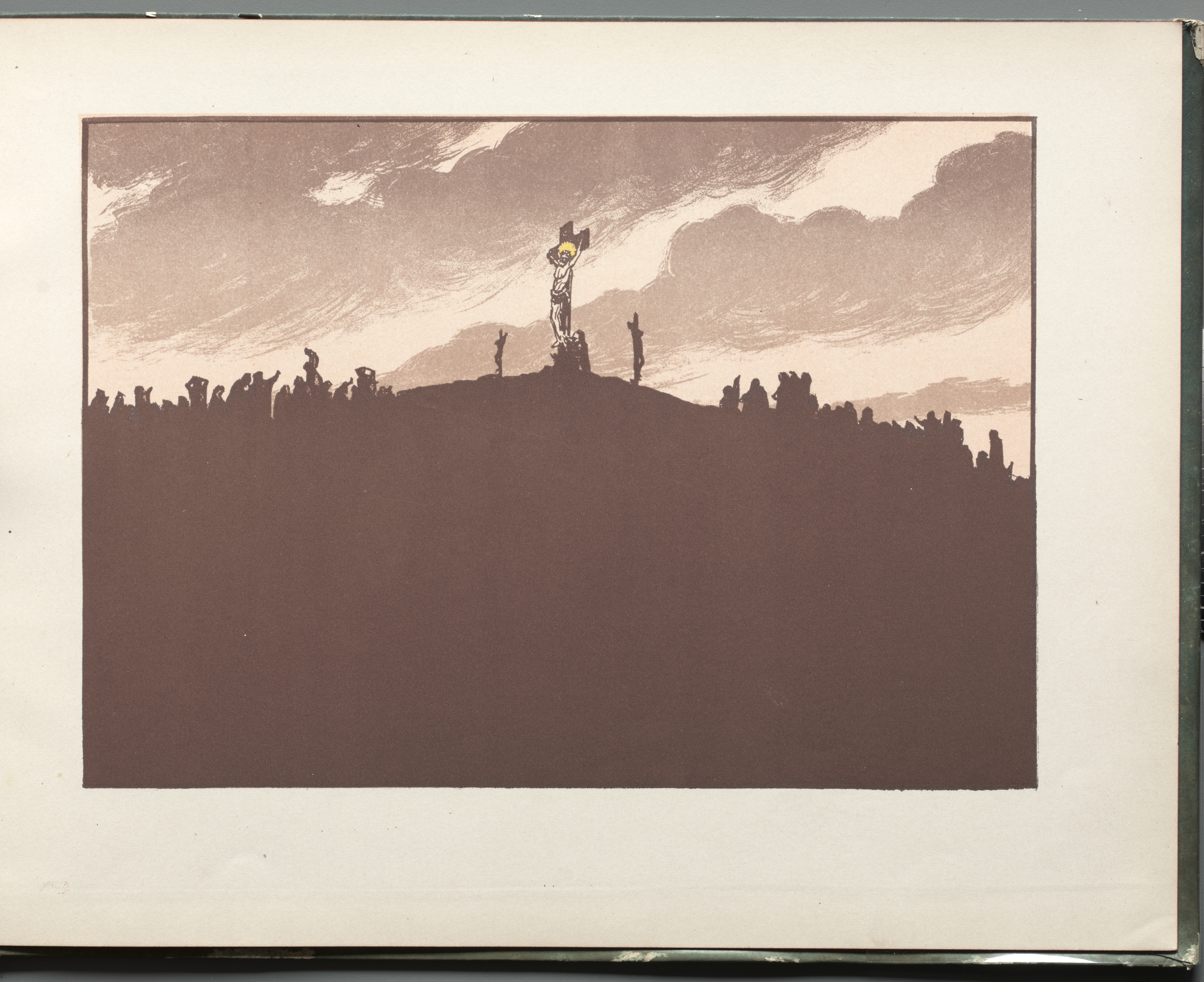 The image is a sepia-toned illustration. A hill with silhouetted figures is in the foreground. The hill slopes gently upward to the center. Atop the hill, a figure on a cross is centered. The figure on the cross has a halo around their head. Two smaller silhouetted figures on either side have their arms raised. The sky above is cloudy, with shades of brown and gray.