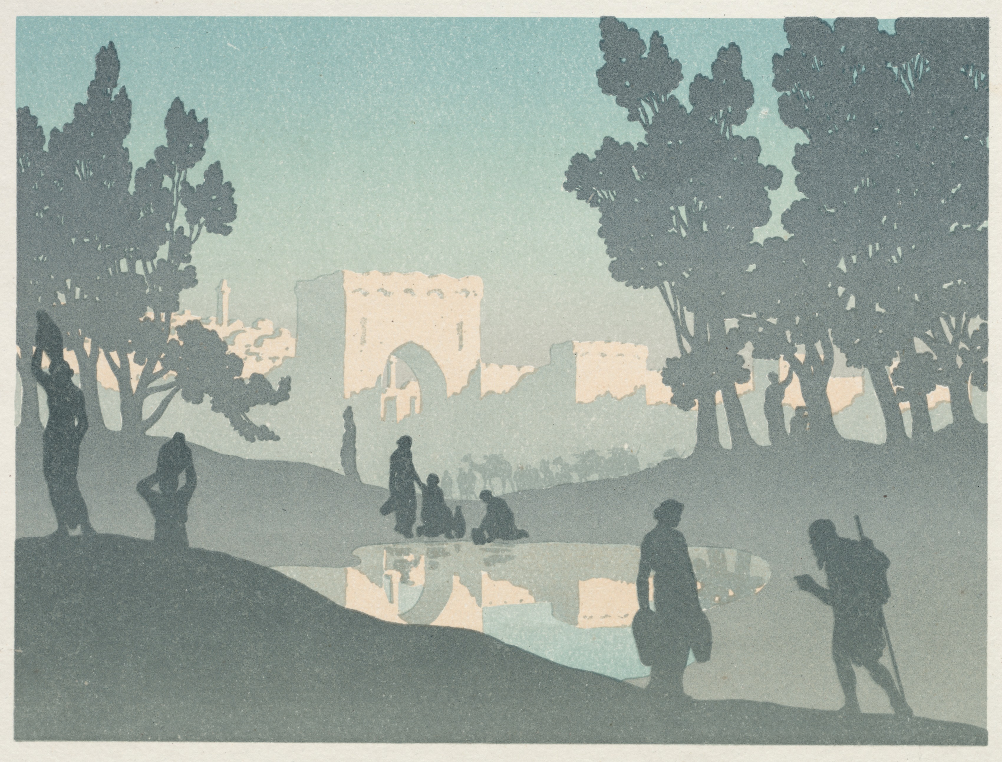 The Wandering Jew: The Old City by Henri Rivière. A landscape with a group of people in silhouette against a light background. The scene includes a body of water near the bottom center with a small bridge. On either side of the water are people standing and sitting, some are wearing hats. Behind them are trees on either side. In the background, a large white building with an archway and other structures can be seen. The sky above is blue and fades into the background. The entire scene is depicted in muted blue, gray, and beige colors.