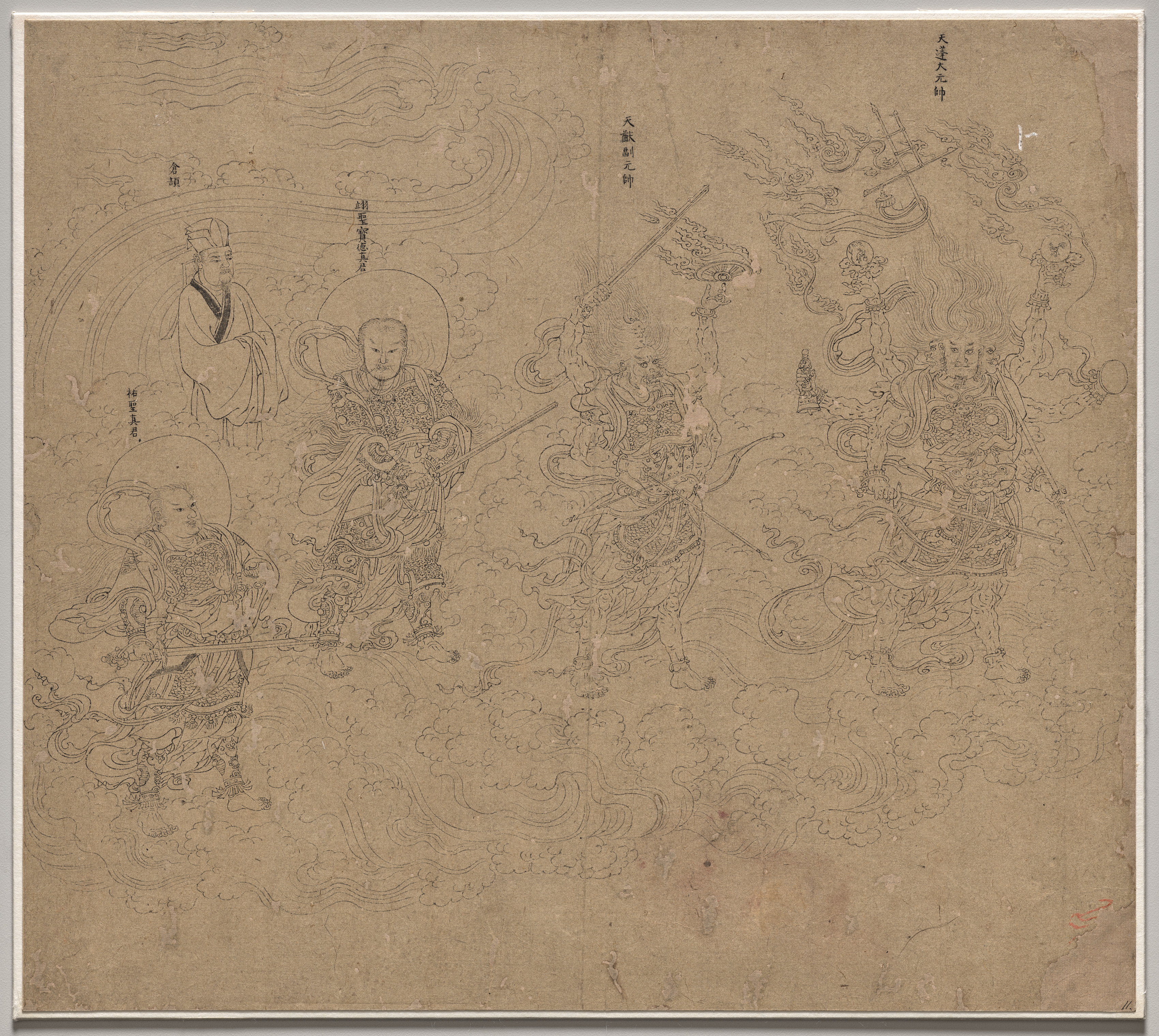 Brown paper artwork with a thin white border. The artwork depicts five figures on clouds, drawn in black ink. The figure on the far left sits on the bottom left. The figure to their right stands with one hand on their chest, and a halo behind their head. The next figure to the right stands with their right arm raised and holding a spear in their left hand. The next figure to the right stands with their right hand on their chest and their left hand on the hilt of a sword at their side. The final figure on the far right appears to be riding a dragon or other creature that has its mouth open and is surrounded by clouds. The background includes clouds, a rainbow, and Chinese characters.
