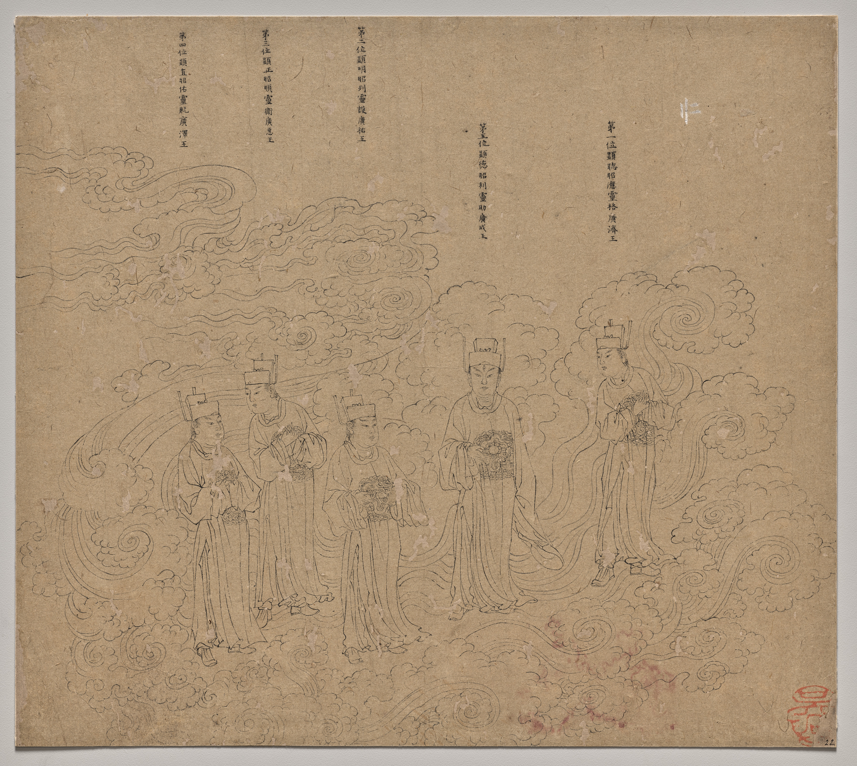 Tantric and Buddhist Themes: Procession of Daoist Deities: Leaf 22, by unknown artist. A drawing on aged brown paper depicts four people in long robes and headwear, likely crowns, holding bouquets. They wear long, flowing robes with wide sleeves. Their faces are drawn simply with minimal features. They stand among clouds and swirls. The background is filled with clouds, some with swirling patterns. There is text written vertically on either side. The bottom-right corner features a red seal.