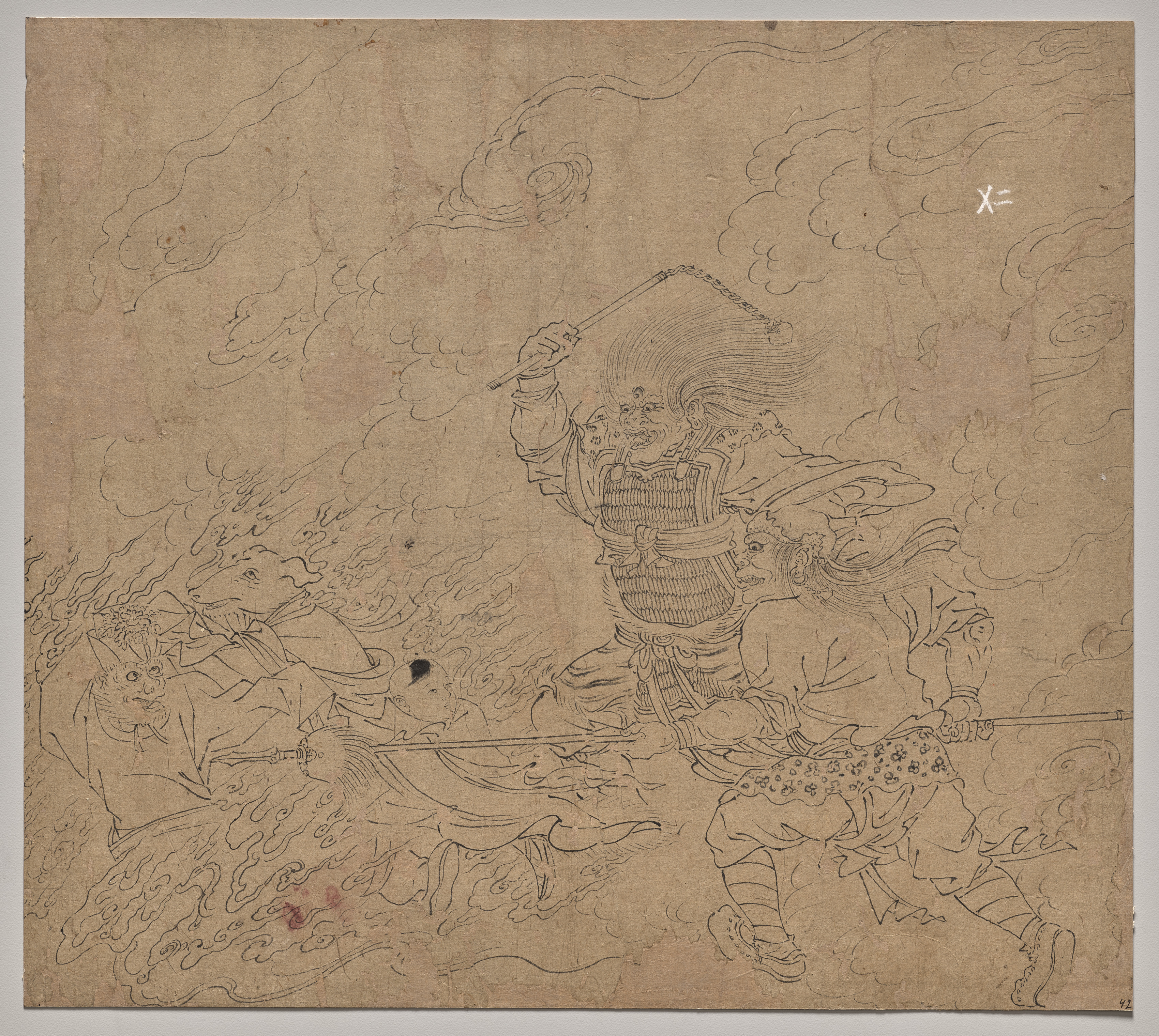 Tanaka Hokusaburo, Album of Daoist and Buddhist Themes: Search the Mountain: Leaf 42. An ink drawing on paper depicts two warriors on a background of smoke. The central figure on the right, a muscular man with long hair wears a tunic and trousers. He holds a long-handled weapon in both hands above his head. The figure on the left, wears a helmet, a short tunic and shorts. He holds a long-handled weapon in both hands and rides a horse. Several clouds are depicted in the background. The drawing appears unfinished.