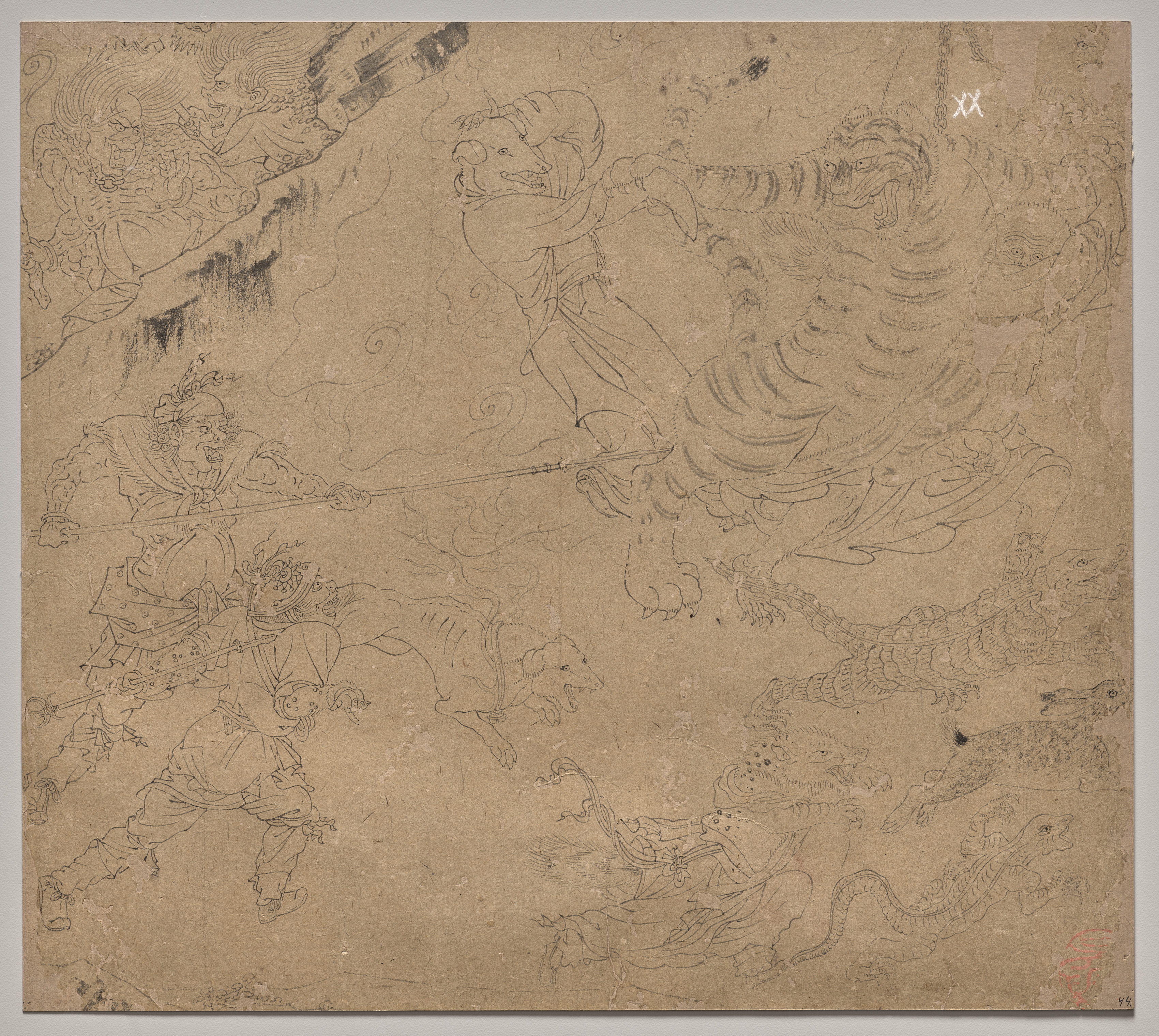 Album of Daoist and Buddhist Themes: Search the Mountain: Leaf 44 by an unknown artist. The image has a sepia background. A figure on the left holds a long pole with a cord on the end. A creature with the head and claws of a tiger and the body of a dragon or snake runs to the right on all fours. The creature has a scaly body and tail with stripes. The figure on the left faces right and appears to pull on the cord which is looped around the creature's neck. A second figure rides a horse to the right with a cloak billowing behind. Two other figures are visible at the top left near a cliff, with a fourth partially visible behind the creature at the top right. Small black marks are scattered on the surface. A white XX symbol is at the top right corner. A red stamp mark is at the bottom right.
