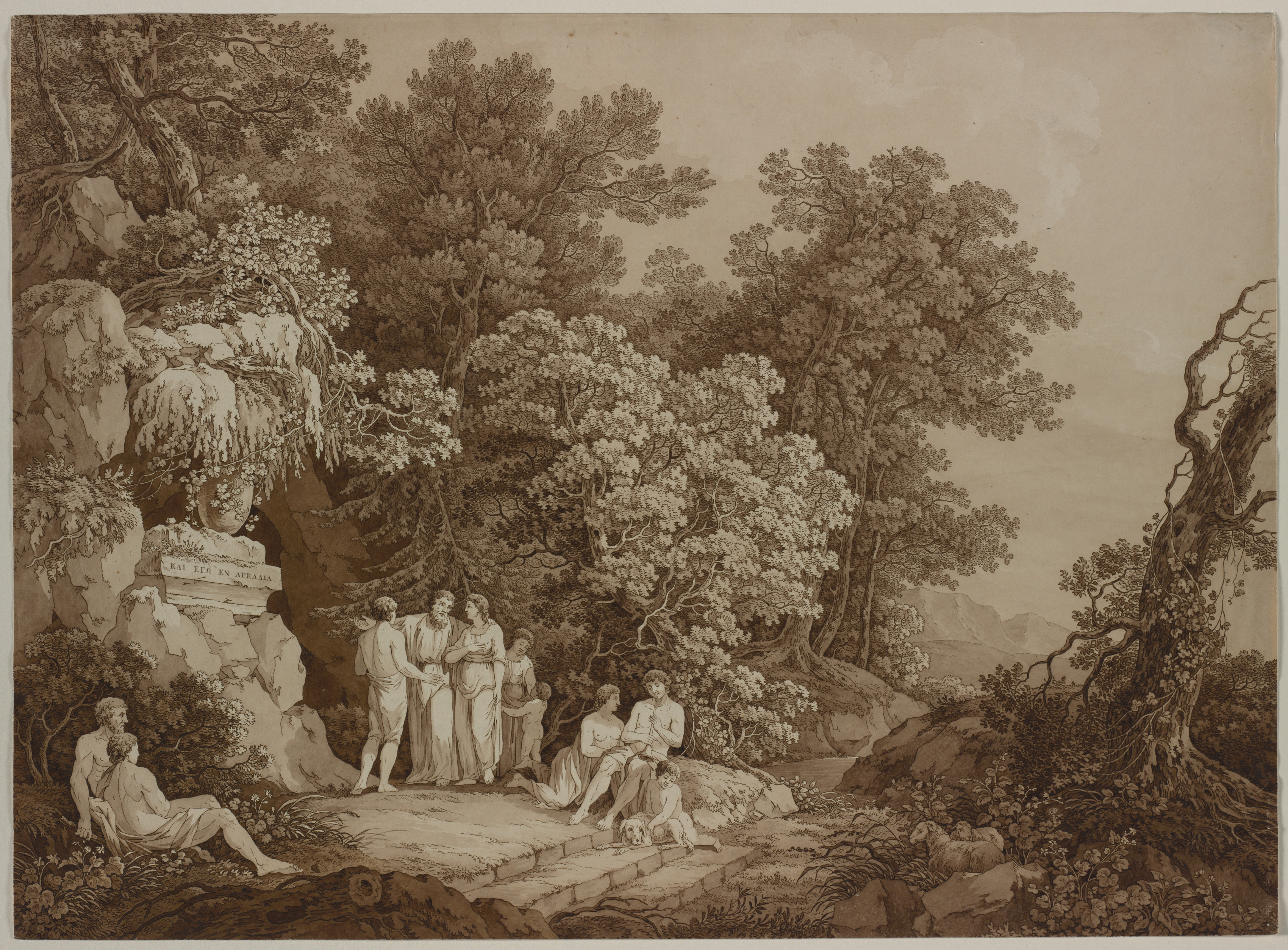 Sepia-toned drawing of a group of people in a forest. The group consists of eight individuals, most wearing long, flowing clothing and standing or sitting on a stone platform. One individual sits on the ground to the left. A large tree with a twisted trunk and branches dominates the right side. A rocky outcropping with a bust and inscription is on the left. Mountains are visible in the background. Trees and foliage fill the scene. The sky has some clouds.