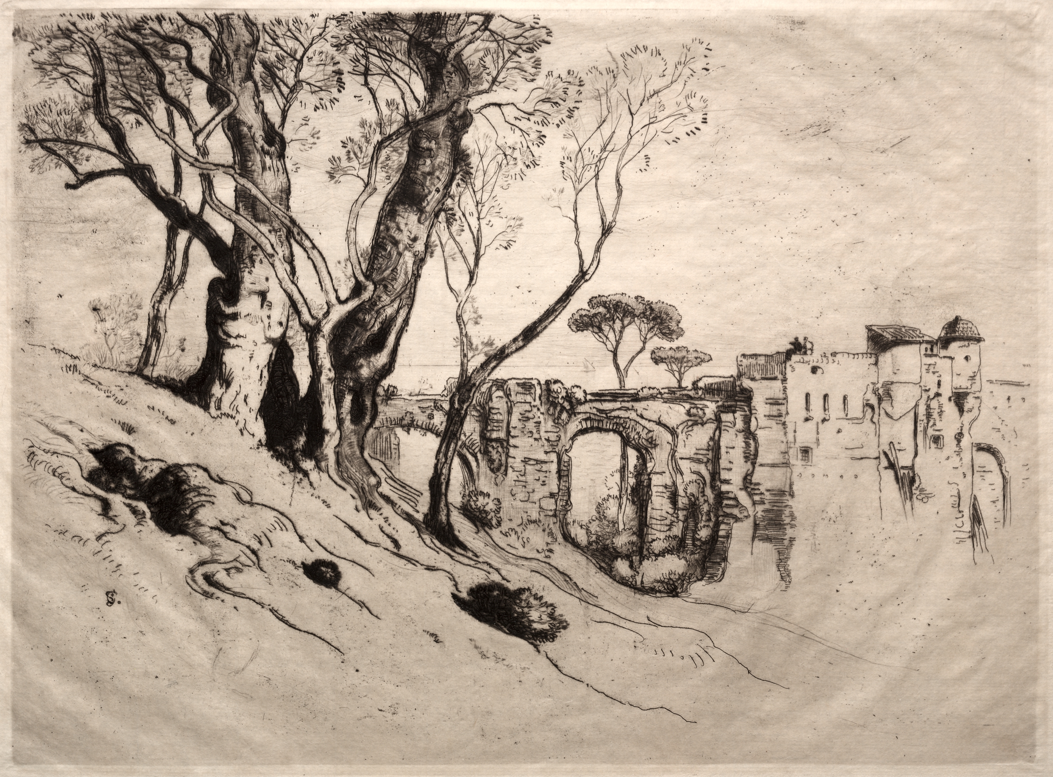 The Olive Trees of the Riviera by Samuel Colman: A black and white drawing of a landscape. Trees with thick trunks and bare branches are on the left side. The trees' roots are visible on a downward sloping embankment. In the background, there is a stone bridge with an archway and a building with a tiled roof on the right side. There are more trees and buildings in the distance. The sky appears hazy.