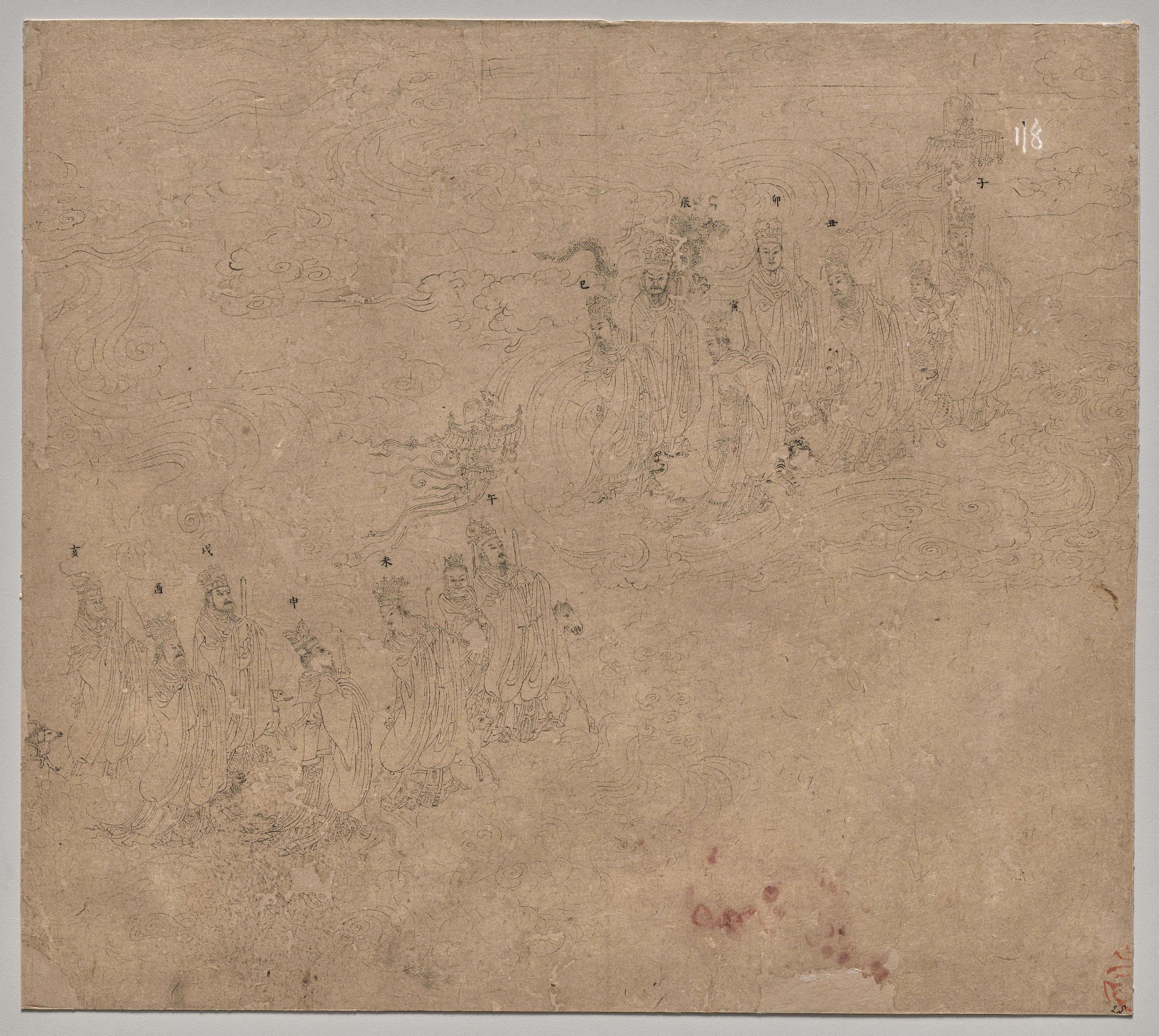 Tantric and Buddhist themes are not depicted; instead, the image shows a procession. A group of figures, likely deities, wearing robes and headdresses are drawn in pencil on aged paper. Six figures on the bottom left are standing on the ground; two larger figures above them appear to be sitting on clouds, accompanied by attendants; other clouds are drawn around them. A few characters are drawn in black; one character is written in white; and a few appear in red near the bottom. The bottom right corner has red seals.