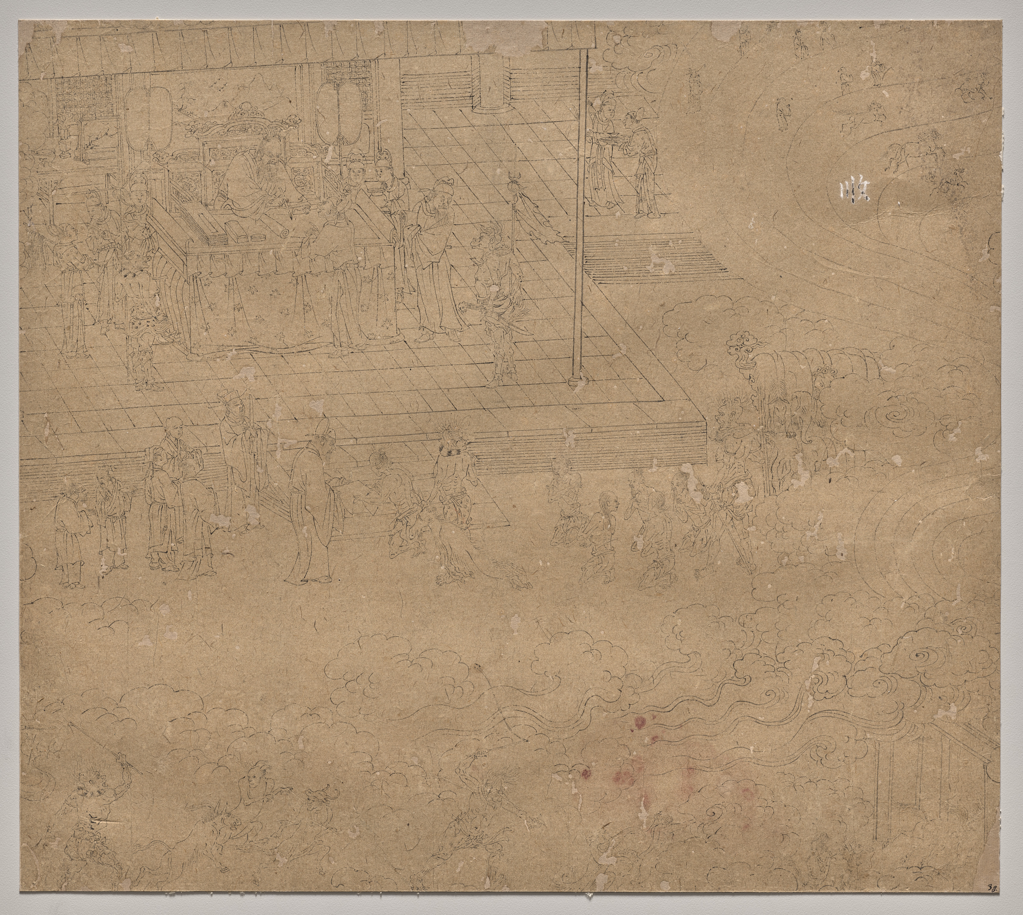 Album of Daoist and Buddhist Themes: Kings of Hells: Leaf 38, by an unknown artist. A brown, aged paper with pencil drawings. The drawing depicts a multi-level scene with figures. The top section shows a raised platform or stage with a group of people. Below the platform, more figures are standing. The bottom section shows clouds and figures, possibly flying or floating. The drawing is simple, with minimal shading and detail. The paper has visible signs of aging, including discoloration and wear.
