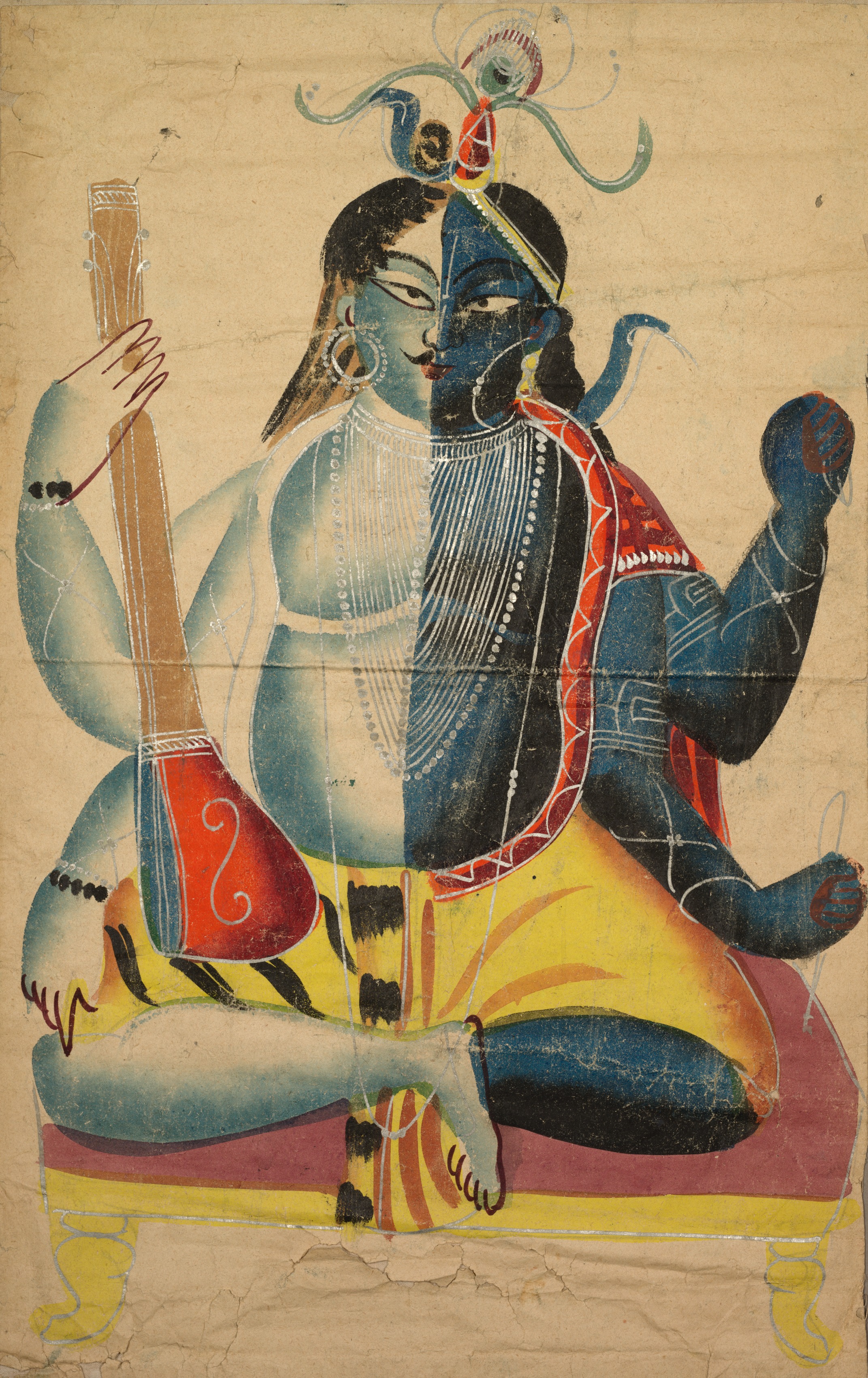 Hari-Hara by unknown artist: A painting of a deity with two colors, blue on the right side and white on the left side. The deity sits cross-legged on a red and yellow throne with a stringed instrument in the left hand. The deity has a red and black shawl over the left shoulder. The deity wears a yellow and black dhoti and has a headpiece on. The deity has a red dot on the forehead, large earrings, a necklace, and bracelets on both wrists. The background color is beige.
