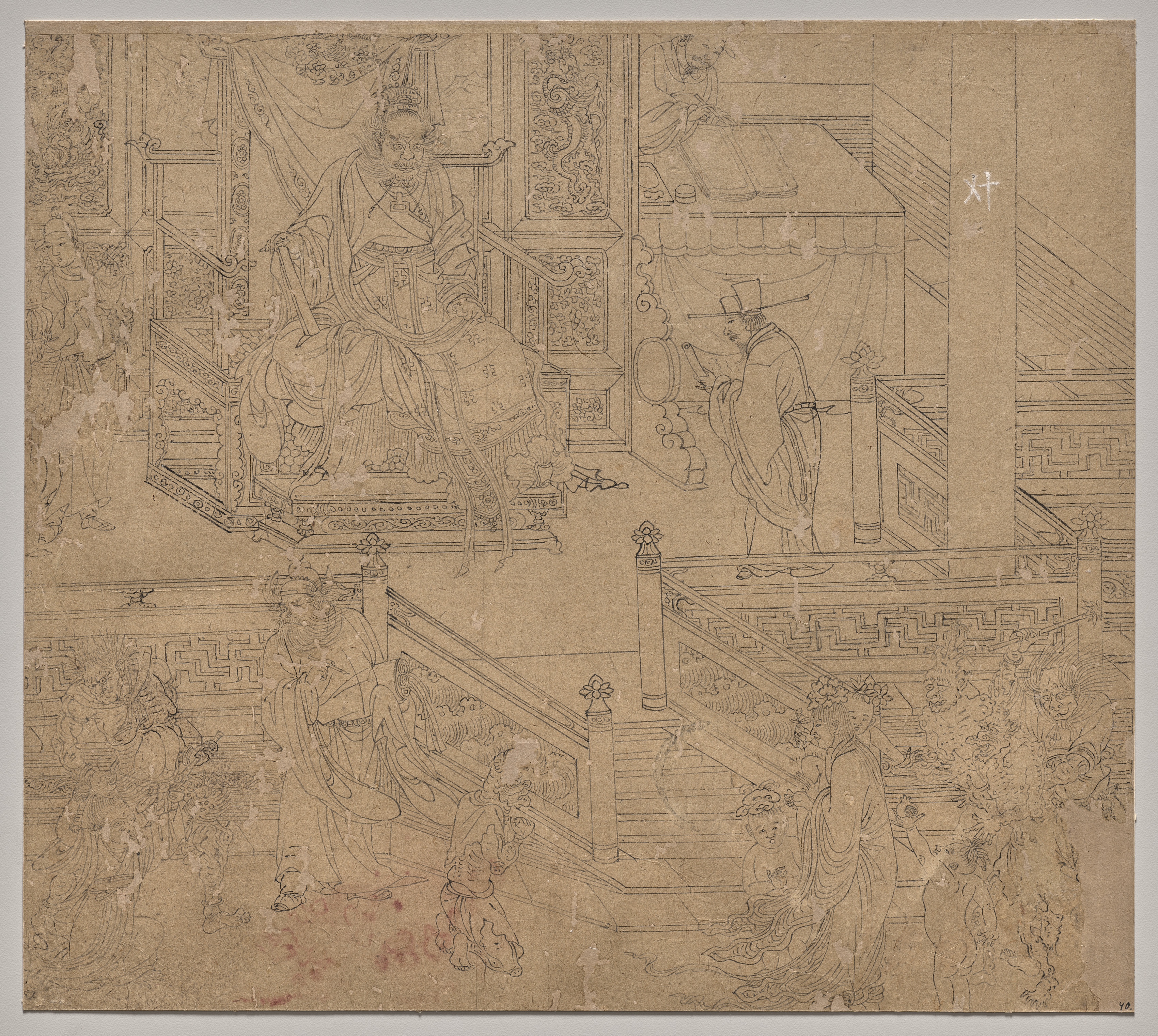 Brown paper artwork with black line drawings and a few red markings; predominantly Chinese characters. The artwork depicts a scene divided into two main areas by a staircase. The top area features a figure sitting on a platform on the left; the figure wears a long robe with a high collar and a hat. In front of the figure is a table. To the right, on a lower platform, is a figure in a long robe, holding a round object. The bottom area features a figure on the far left with long hair and a long robe; the figure faces left and appears to hold a baby. In the middle, a figure descends the stairs; the figure wears a long robe. On the far right, a figure leans over a railing; the figure wears a long robe and has long hair. A figure on the far right appears to be on fire; the figure has wings and long hair, and wears a long robe. The background of both areas features patterned walls.