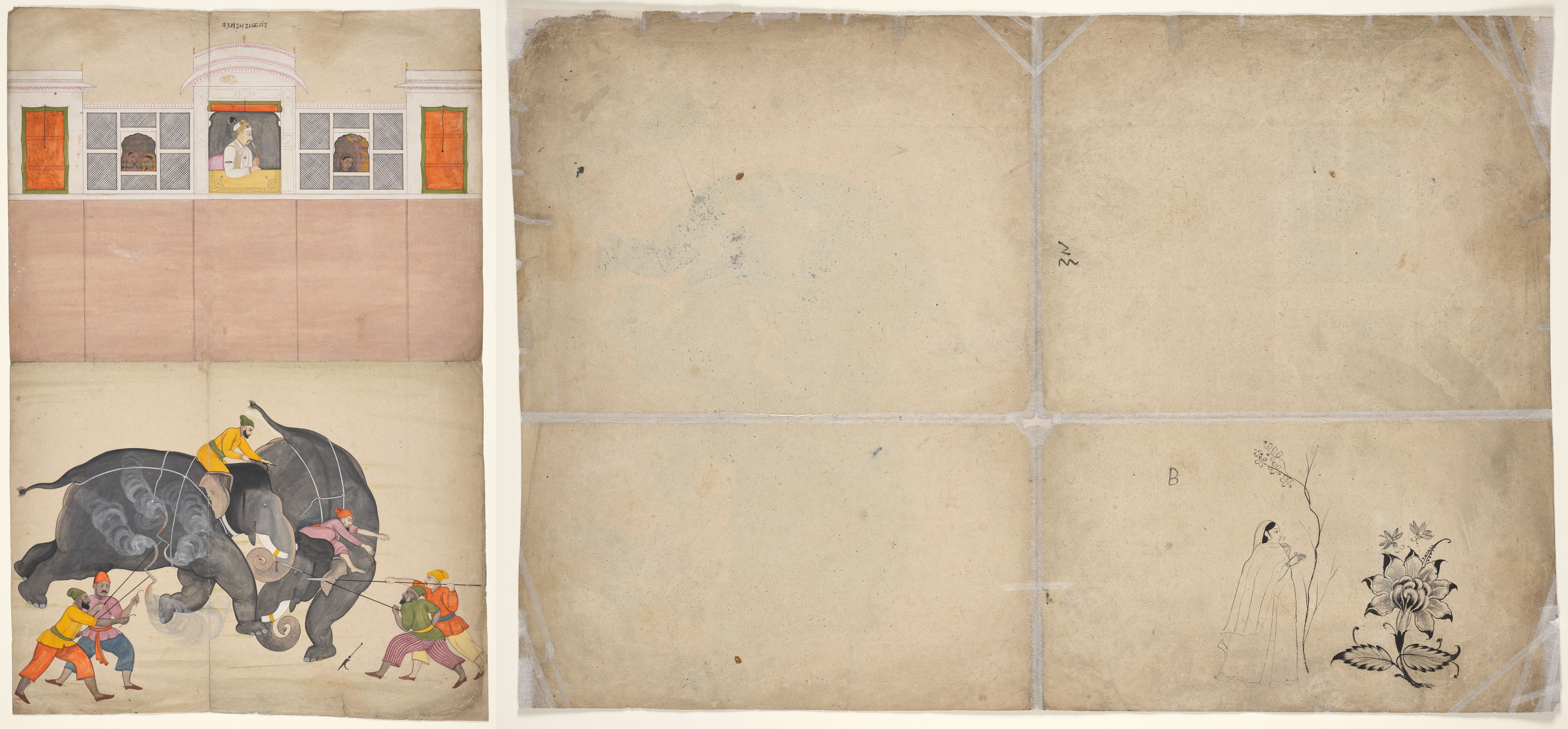 Two-elephant artwork with people; on the left, a colorful illustration depicts a scene: two gray elephants fighting; one elephant is on the left with a rider wearing yellow, another person runs left; on the right, another person wearing pink runs; background shows a brown wall with a white building on top; the building features brown and orange doors and windows with a person sitting. The right side shows the back of the artwork with visible tape and a small plant drawing. Title: Two Elephants Fighting in a Courtyard Before Muhammad Shah. Artist: Nainsukh.