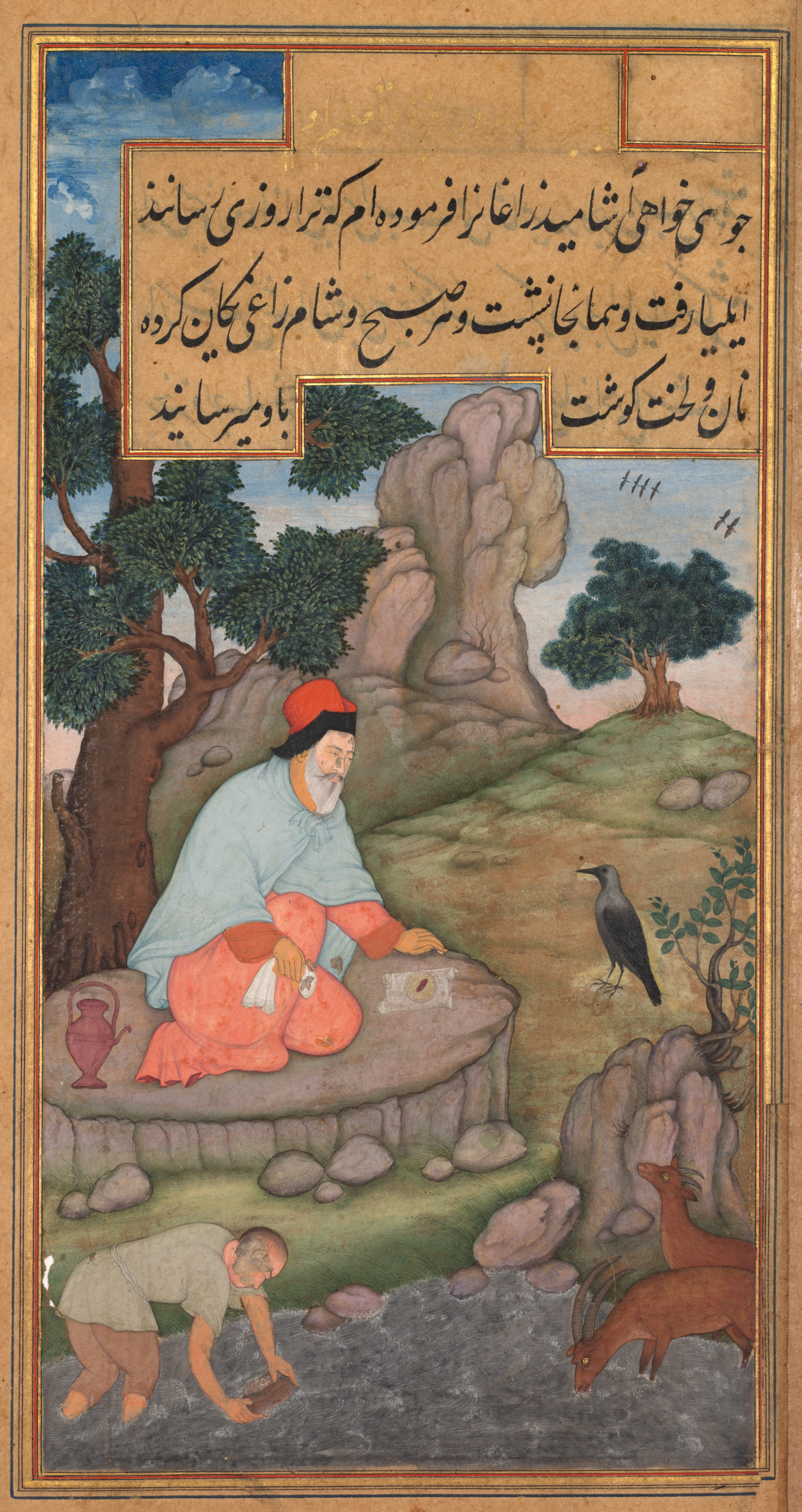 A raven brings food to Elijah (folio 72 recto), from a Mirror of Holiness (Mir’at al-quds) of Father Jerome Xavier,
